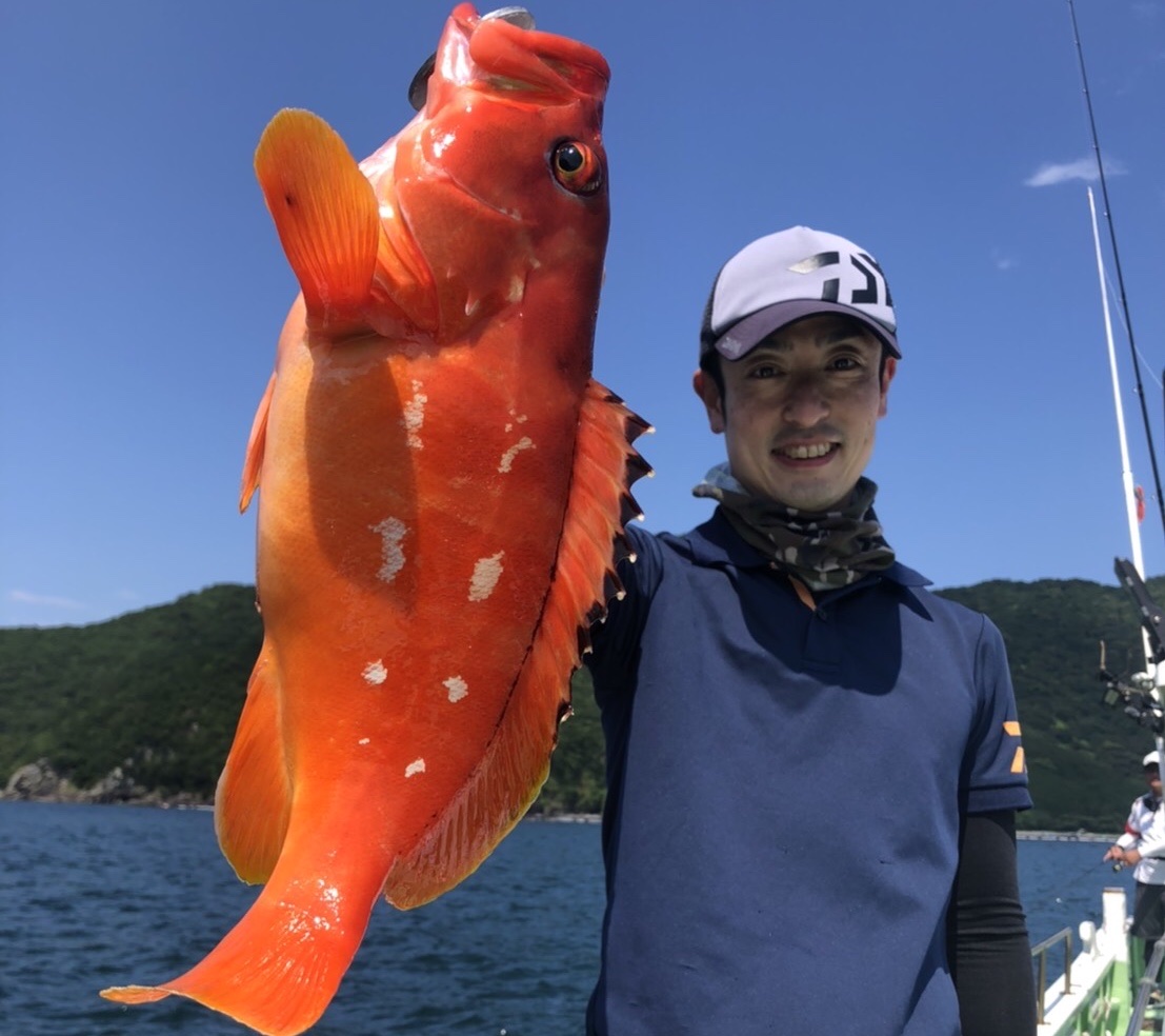 三重県引本のエヌテックマリンさんで船からのロックフィッシュゲームを楽しんできました。朝一に簡単なレクチャーを受けて5時30分に出船。ポイントに到着し釣り開始早々にミヨシ側はオオモンハタヒットで盛り上がる!しかも津店の佐久間副店長に48cmのビッグワン!私はトモで乗り遅れていると、船長がマンツーマンで巻くスピード、フォールでの誘い方、アタリの取り方を教えてくださいました!どの位底から巻き上げてるか、分からなかったら一度落として何M沈むかラインのマーキングを見たら分かると。船の流される速さとキャストする向きで巻くスピードが変わるコツを掴んでからは、おもしろいように釣れまくり、オオモンハタ、アカハタ合わせて27匹位釣れました。マルキューのスイミングテンヤ30gにバルト4インチ、カラーはイワシがこの日1番のヒットルアーでした。でもポイントや時間帯によっては他のカラーやワームの種類に変えた方が良い時もあったのでワームは多めが良いですね。根がかりは長い釣行時間で1回だけでほとんどしません。ジグヘッドの重さは30gがメインです。アタリが多く、釣れるサイズもデカイ!最高に楽しい船からのロックフィッシュゲーム!皆さんも是非チャレンジしてみてくださいね!