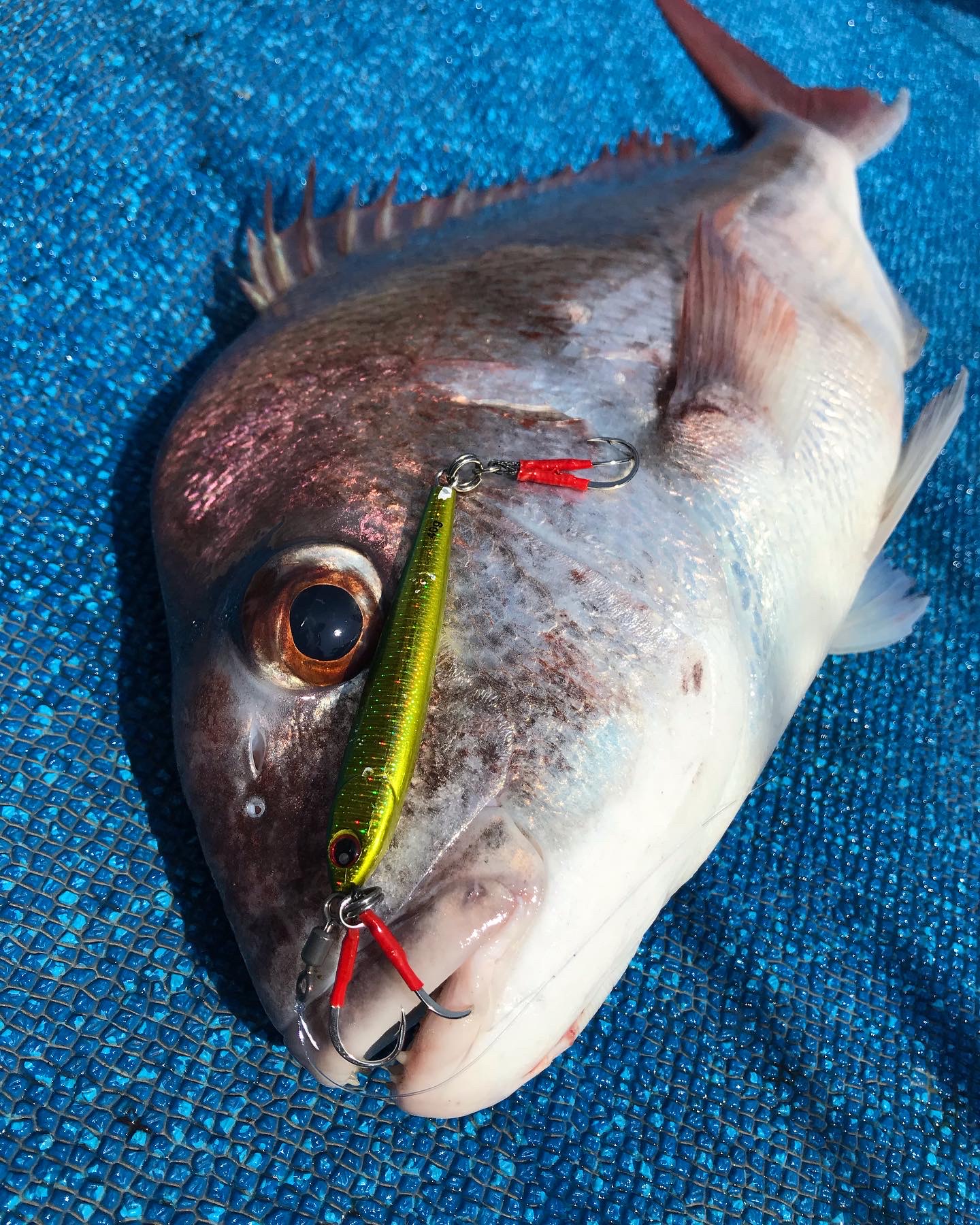 朝一、強烈な鳥山が!水深が浅いので、ジグをキャストして、底からワンピッチで誘ってくるとすぐヒット!好活性な大ハマ連発!パンパンで美味そう!大ハマに混じり、マダイも連続ヒット!40gか50gのジグで、細かめのワンピッチが良かったですよ♪