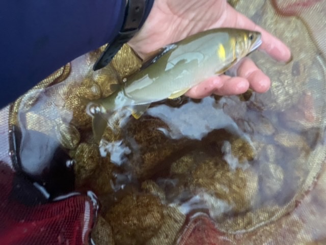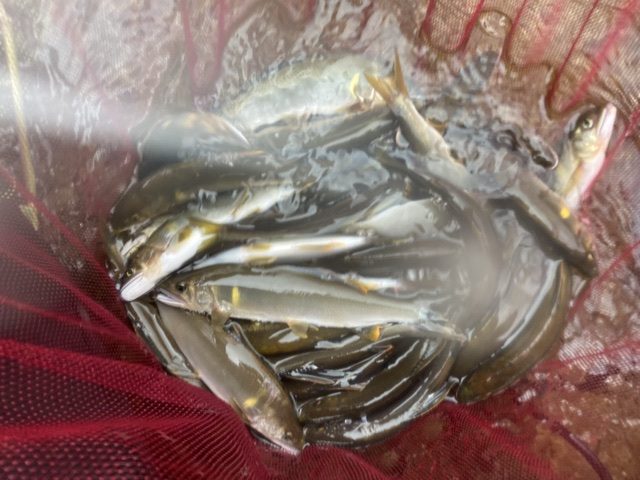 大又川の鮎解禁日に行ってきました!天気はあいにくの昼から雨予報ですが、解禁日らしく釣り人は満員状態!夜中から、川に入って場所取り合戦!私たちも、3時半頃から入川して、明るくなるまで待機します。4時半ごろには目印が見えるぐらいになったので、おとりを付けてスタート!開始5分で、幸先良く、今期初鮎!解禁日には良型の20センチ!午前中は、竿一本分の、自分の場所の飛びつきを抜き切って、その後もそのままコンスタントに掛かり、昼ごろに、スローペースに、なってきましたが、雨もパラついてきて、13時過ぎには雨が強くなったので、私は納竿しました。16センチから20センチまで、込み61尾掛ける事が出来ました!サイズも半分くらいは20センチ超えで、満足の出来ました!