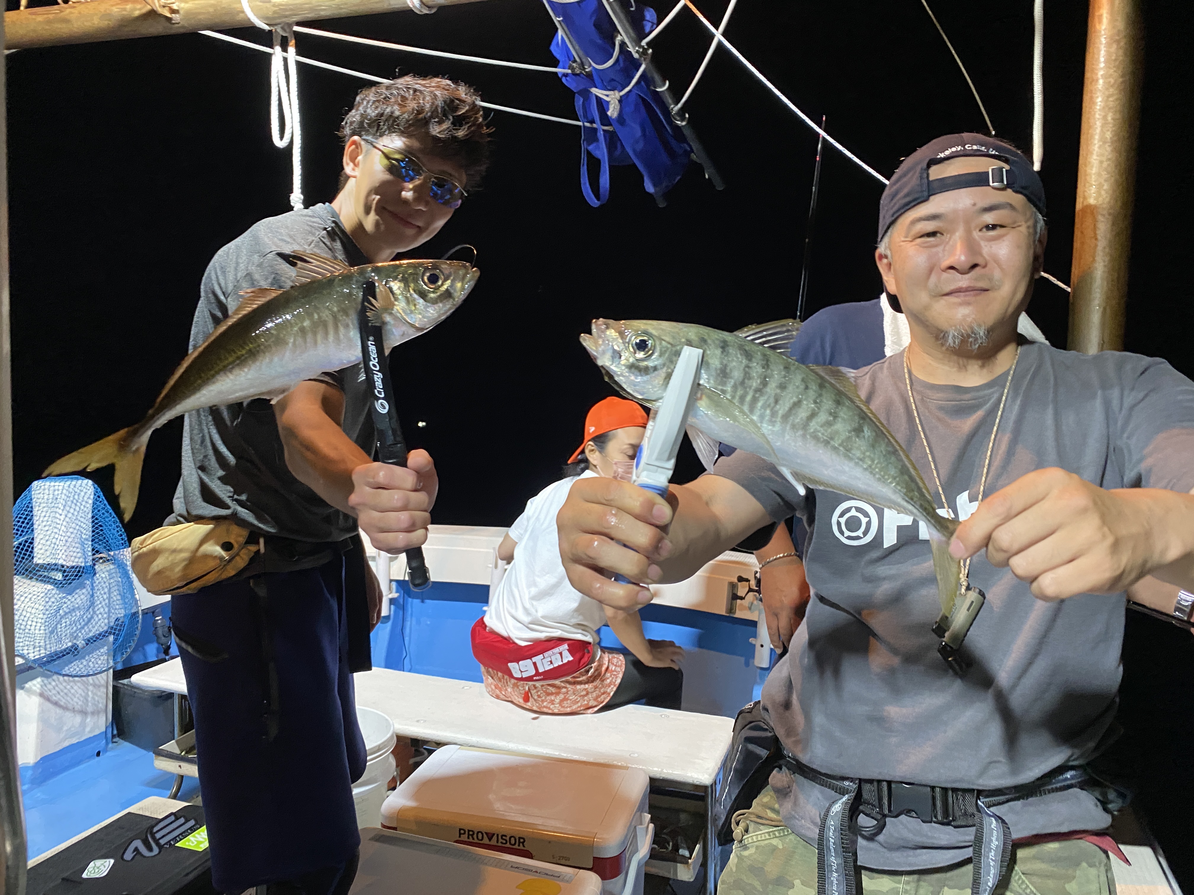 2日目も水深60mぐらい。この日は上潮が速く、30号のオモリでやりました。灯りが効きだすと、早々にヒット!40㎝ぐらいのアジ!それからポツポツとヒット!途中、入れ食いタイムもあり、船中100匹近くの釣果でした!