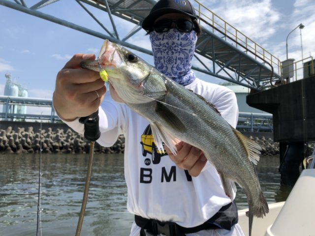 知り合いの船で四日市周辺のボートシーバス&マゴチを狙いに行ってきました。7時頃出船、曇りの予報がカンカン照り、、、まずはバース打ちで同行者がヒット!するも乗り切らず。連日の雨でかなり渋くなっているようで投げまくるもアタリすらほとんどなし。水が茶色く濁っているので目立つようにナレージのチャートカラーに変えて少し沈めて巻き始めるとキタ!!ということでなんとかシーバス1匹。その後マゴチ狙いに変更して同行者はピンク系のワームで2匹。自分はダート系ワームのボトムワインドで1匹。潮が引いてきて浅くなったところで最後にシーバスの穴打ち。クミホンを奥の奥へ打ち込んでワンバイトあるもエラ洗いによる無念のバラしで終了でした。