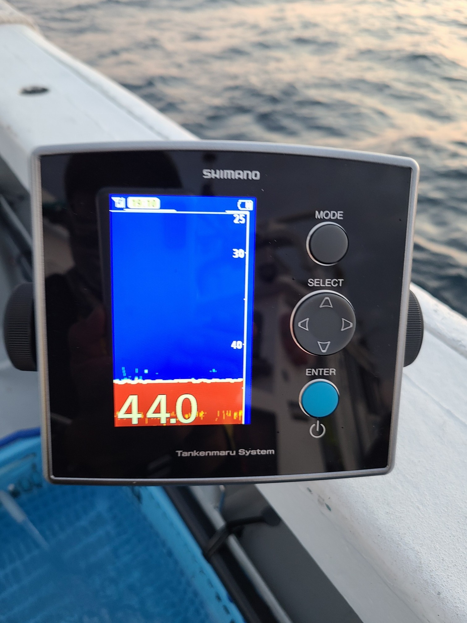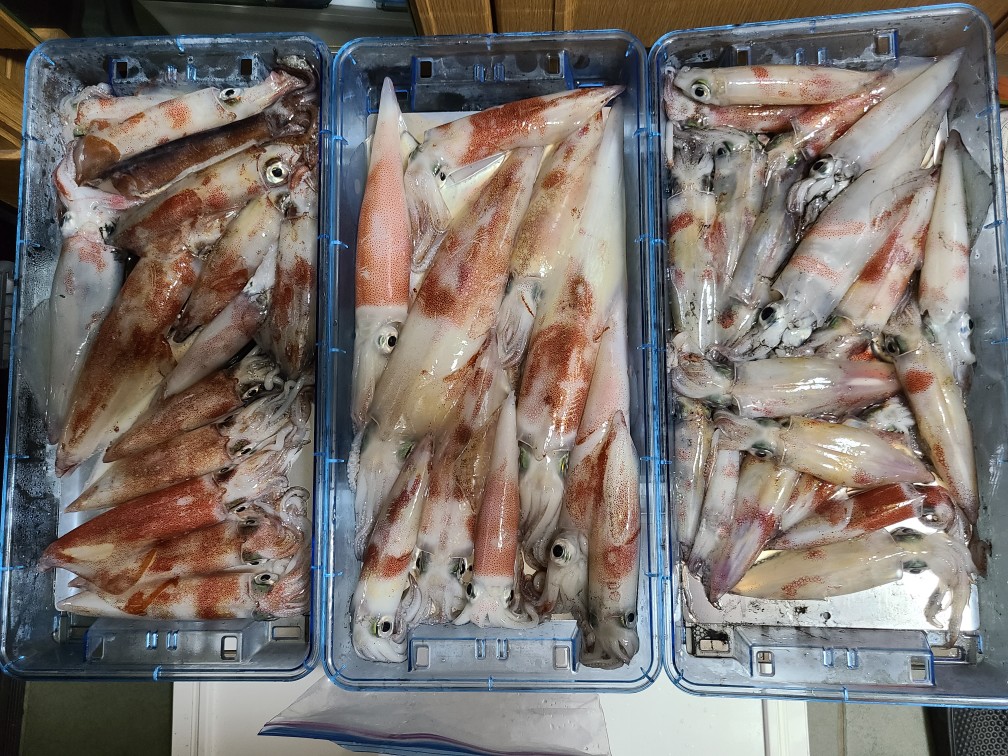 ポイントは越前沖で港から10分程で到着!!出船が18:00でしたので最初は、水深44メートルのボトム付近を探るもマイカからの返事も無く時間だけが過ぎていきましたが、20:00頃からマイカからの返事が届くようになりアタリの棚も35メートル位から20メートル位の間で続き活性も良く楽しめました。水深も比較的に浅いのでナマリスッテも15号メインでいけます。今回のヒットカラーは、赤緑・赤黄・紫でした。探検丸を初めて使いましたが手元で海中が見られて大変便利でした。