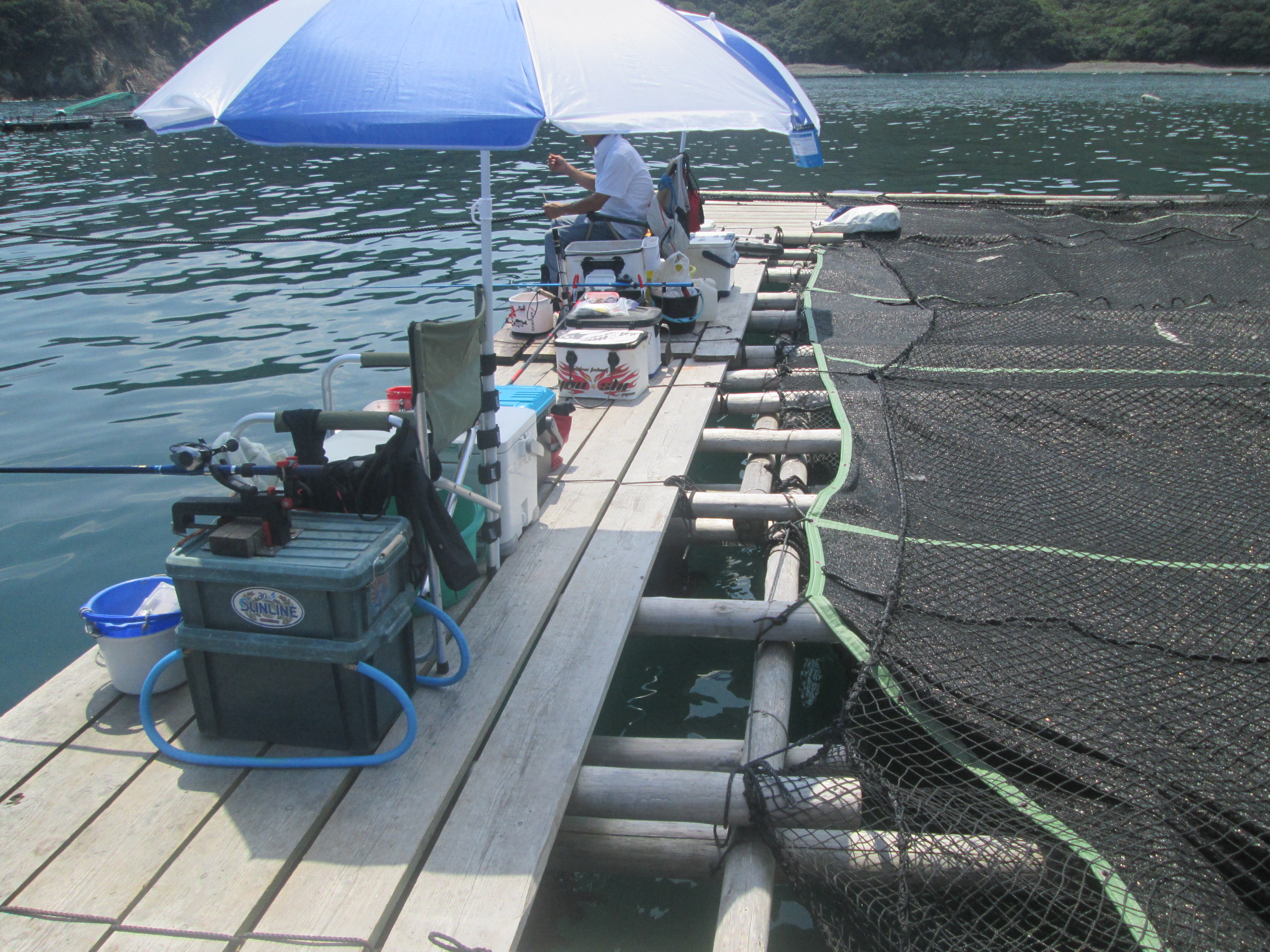 今回養殖ネットが有るので長めの釣り堀の竿で挑戦しました。
