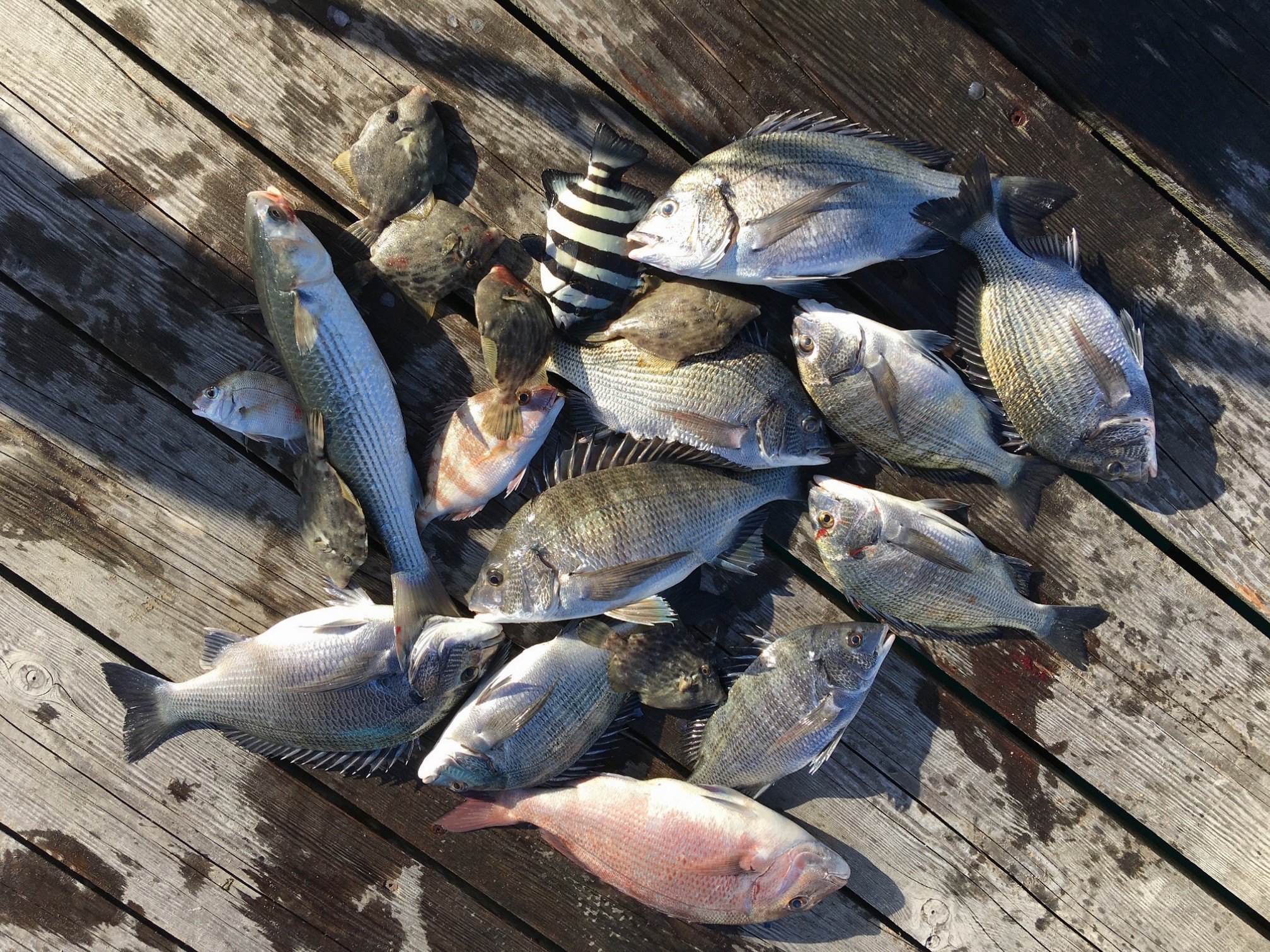 緊急事態宣言が終わり、今良く釣れている「あけぼの旅館」にチヌの筏釣りに行って来ました。5時半、筏に渡り友人は五目釣り、自分はチヌ狙いで分かれて釣り始めました。友人は最初から手のひらサイズのカワハギをコンスタントに上げています。自分は早い潮でうまく流せずに苦戦していると、隣でやっていた師匠が大型のマダイを釣り上げました。この筏は敦賀湾の入り口にあり観光で有名な水島も近くに見え、青物、マダイが良く釣れるとの事。自分も何とか釣りたい!!オキアミを付けダンゴを落すと穂先を押さえる待望のアタリ!!竿をしならせ上ってきたのは30センチの綺麗なチヌでした!!