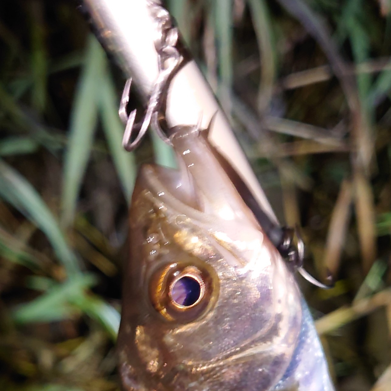 このポイントは、やはり全体的に水深が浅く、ウェーディングに気を遣い過ぎ、思っているレーンにルアーを入れにくい為、少し観察しながらポイント調査しました。後30分もしない内に潮止まりになってしまいます。汗だくで藪こぎして辿り着いた場所は?パラダイスか?ドキドキのファーストキャストでイキナリ、ロッドをひったくるバイト!1m程ラインを引出しスグにフックアウト…。気を取り直し2キャスト目!カッツン!おっ!とアワセと同時に魚が飛んできた、ナント25㎝クラスのシーバスです…。0:00のマイクロサイズより更にミクロレベル?!そろそろ落ち鮎狙いのランカーシーバスが動くハズ!
