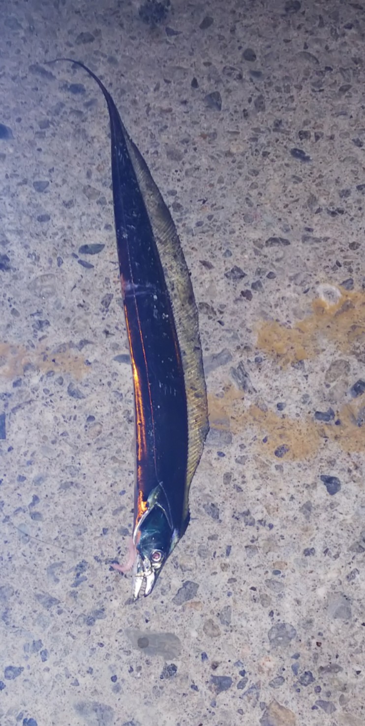 続けるとまあまあの引きでアジ。ポツポツとあげた後はセイゴ入れ食いの時間が始まり。堪能したあと一瞬の静けさからカツン!と。長いシルバーの魚影が。なんと!太刀魚。そのあとはアタリが 無くなり終了。あっ、なぜかサバも来ました。面白い日でした。