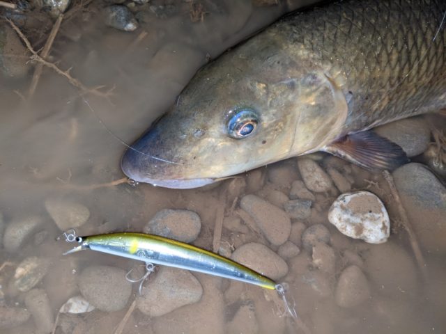 上げに転じてる時間でしたが、流れは強く下流向きに流れてるので、ルアーを流して瀬の終わり際まで探っていくと…