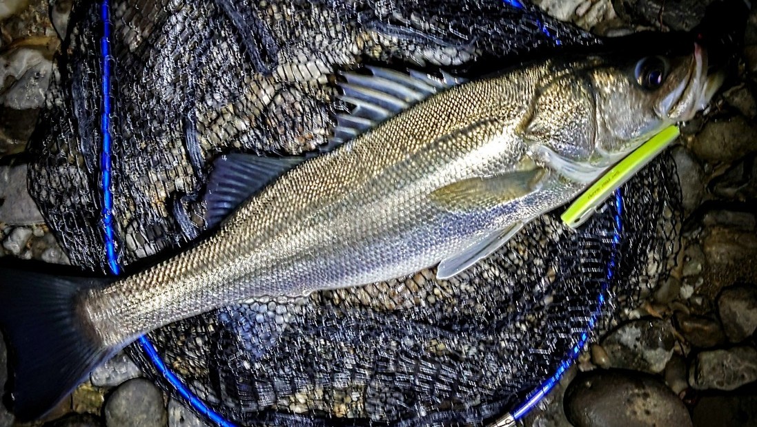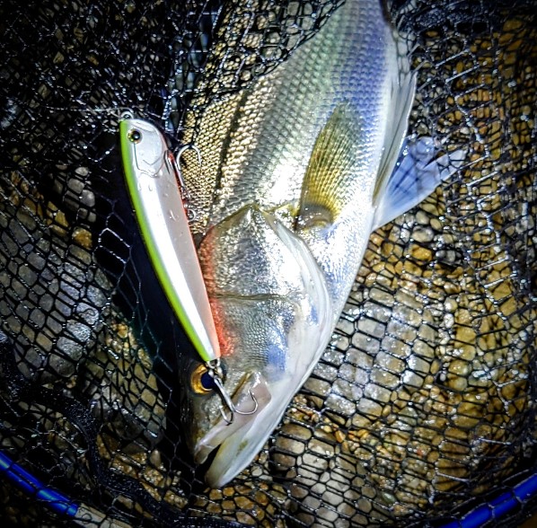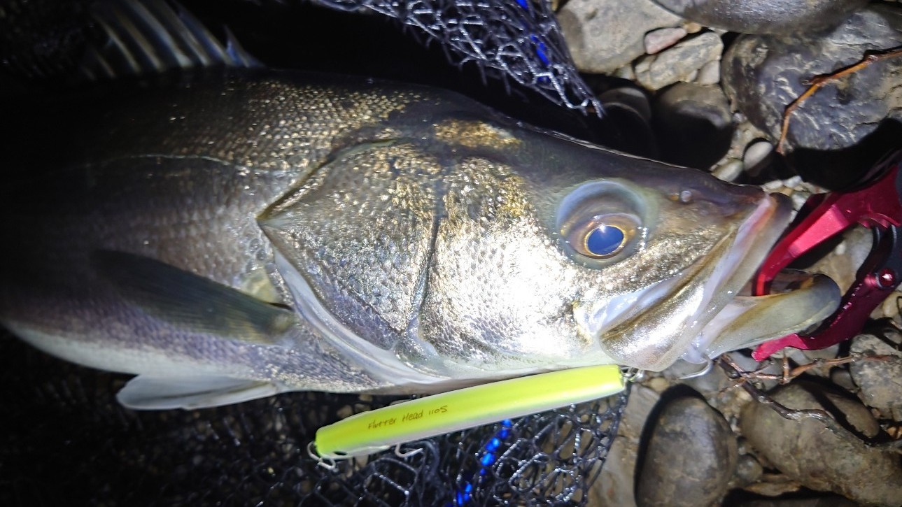 昨日と同じ下げ潮のタイミングで、カケアガリへルアーを流し込むと…、『ゴッゴゴン!』『ジィーーーーーッ!』ヒットー!下げ潮の勢いに乗って下流側へ強烈に走りカナリのサイズだとロッドを通して感じます。自分も下流側へ下がりながら距離を詰めランディングネットに手を掛けた瞬間、フックアウト…、無念!気を取り直し同じコースへキャスト!今度は少しサイズダウンしたようで簡単に寄ってきましたが魚体を確認できる位置までくると…、予想を遥かに超えたサイズ!目の前でテイルウォークをくり返され…、再びフックアウト…。うーむ…まだまだ!少し反応が無くなりましたが5投目でヒット♪ 今度は慎重にファイトし無事ランディングネットに収まりました!先程バラシた2本より少しサイズダウンの65㎝クラス。少しずつシーバスの付き場をズラしてルアーを流し込み2本追加!同じポイントのためサイズダウンしていきます。少し休ませて、更にもう1本追加した所で潮止まり。合計4本ハントして大満足で家路につきました。