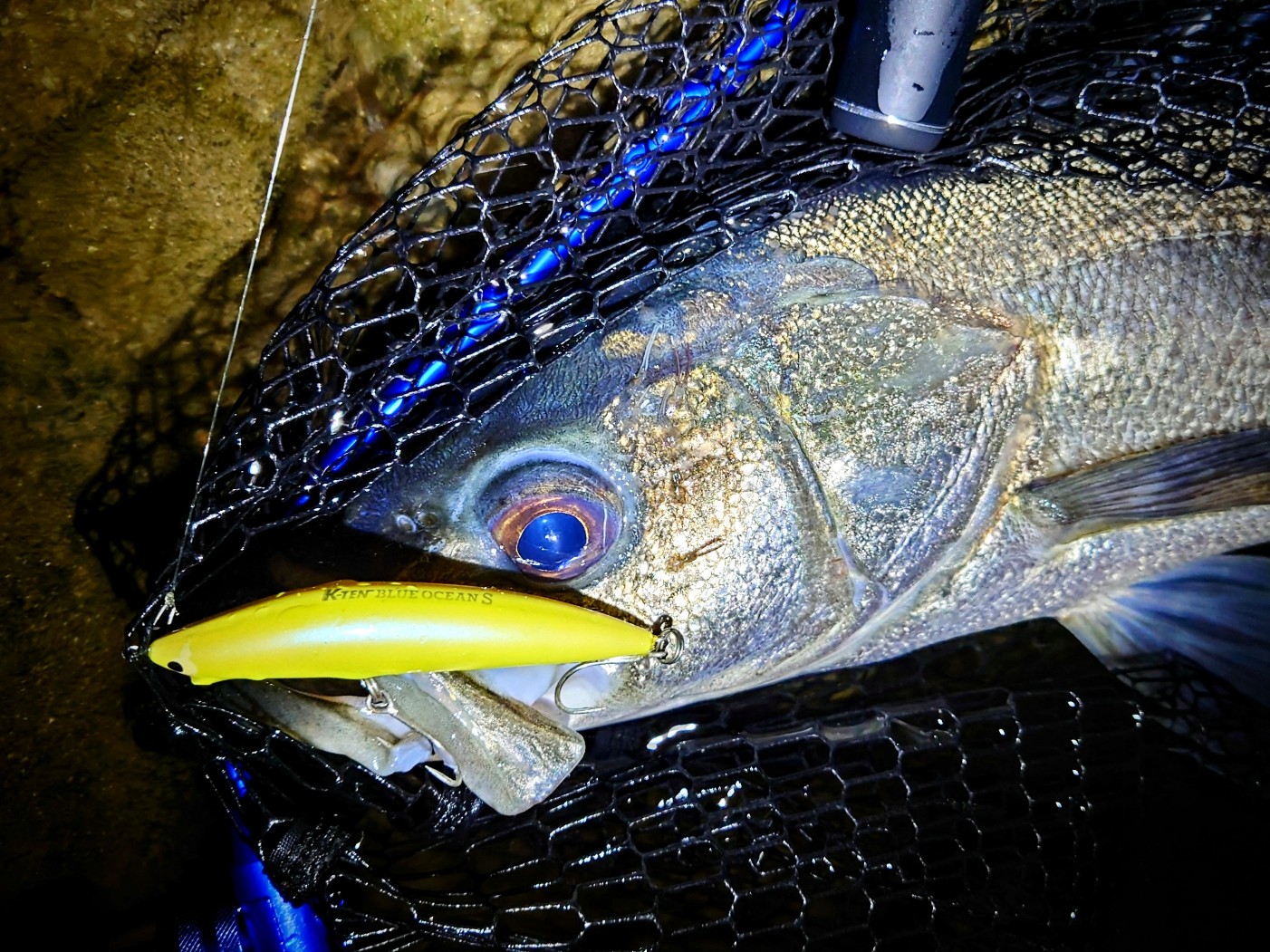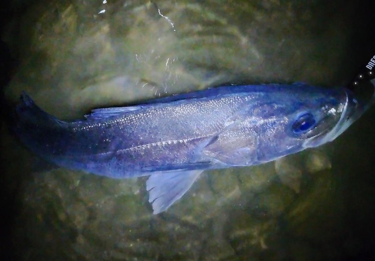 干潮が深夜0:34なので時合はおそらく2時間前の22:30頃と設定、セオリー通りのベイトがシャローから水深のある所へ移動するタイミングでシーバスの活性が爆発する予想です。21:30からゆっくりポイントチェック、カケアガリをゆる~くルアーを流してみます…、『フワッ…?ガッガツーン!』エッ?イキナリのヒット♪ 慎重にやりとりしてウェーディングネットに収まったのは、65㎝!しばらくポイントを休めて22:15から再開!流れのキツイ所を過ぎた辺りで…『カァーン!ジャーーーーッ!!』かなりドラグを引きずり出して止まったので強引にポンピングして寄せ、手前で何度も突っ込まれましたがネットで御用!70㎝を余裕で超えたナイスボディなシーバス♪ しばらくネットの中で眺めていました。カルティバ STX-45ZX #3が2本共伸びていました…、フトコロまで刺さっていたので強引なファイトがフックを伸ばしてしまったかも…。最初のフッキングは効かせ過ぎくらいにセットアップできたハズ…。いろいろ考えながらシーバスの回復を待って、そっとリリースしました。