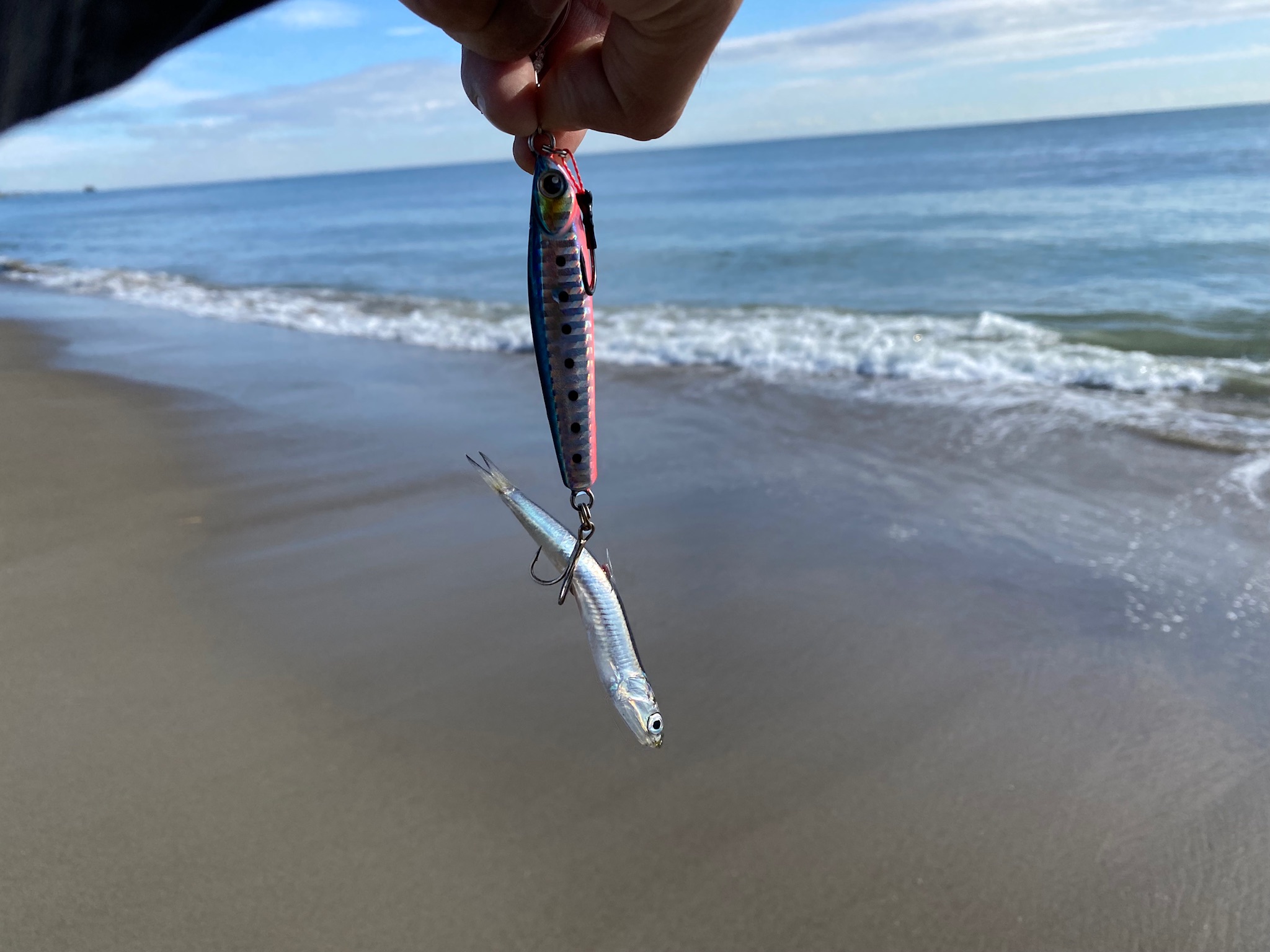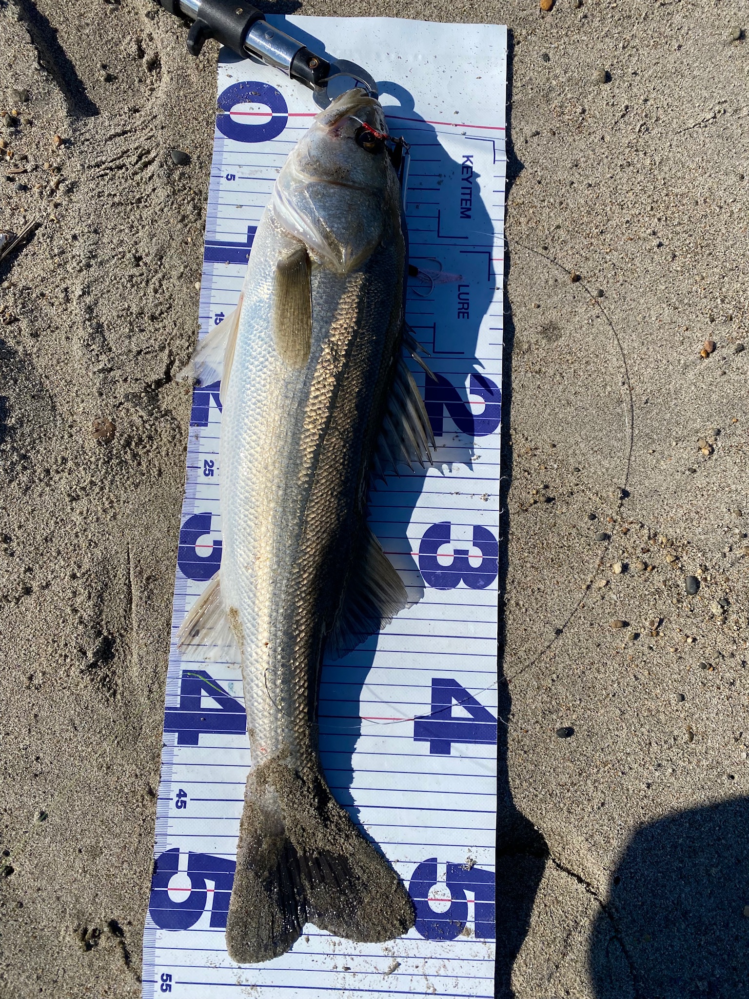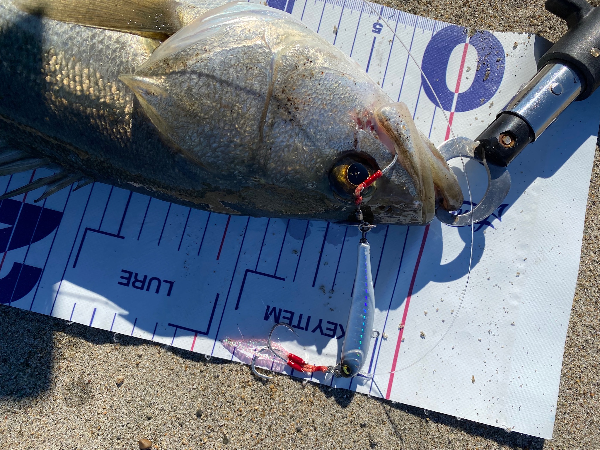今回は伊良湖〜田原サーフに青物、フラットフィッシュを狙いに行ってきました。到着したのは朝10時。平日で朝まずめも終わっていたので、釣り人は少なめでした。見晴らしの良い場所からベイトをチェックすると、遠くに鳥山。急いで鳥山のポイントに向かいました。到着後も鳥はパラパラと飛んでいます。海を見るとベイトで真っ黒。爆釣の予感!!開始数投でアタリ!!メガバス マキッパ40gを巻いていた所、波打ち際で喰ってきました。ベイトが入っている時は波打ち際でのバイトが良くあります。いつものパターンだとヒラメかな?と思い釣り上げるとシーバス53cm。ベイトを沢山食べているお腹パンパンのシーバスでした。その後はたまに3〜7cmぐらいのカタクチイワシが打ち上げられるような最高の状況でしたが、追加できませんでした。伊良湖〜豊橋サーフにベイト接岸中!カタクチイワシがベイトの時はメガバス マキッパがおすすめです!