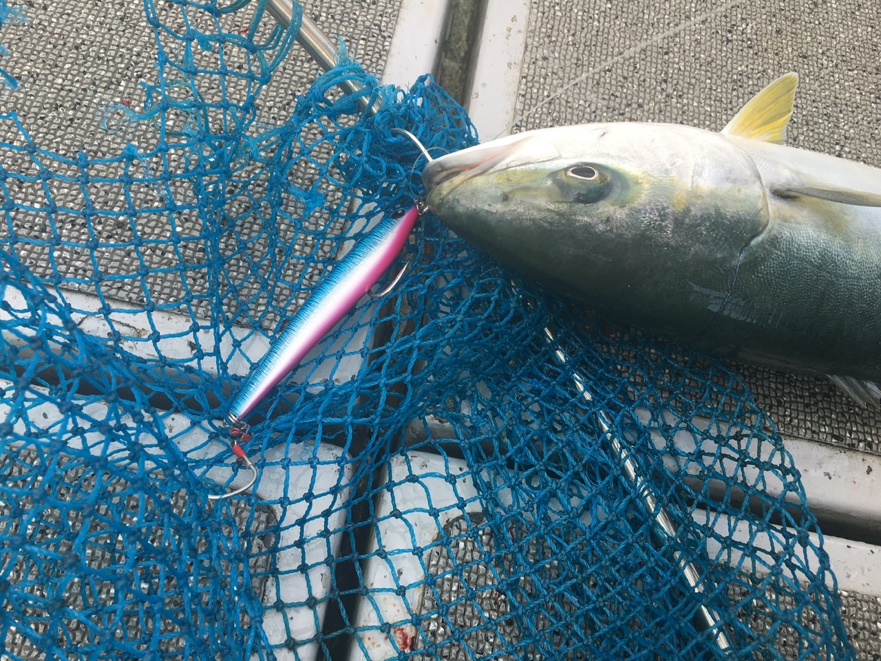 三重石鏡のオーシャンズマロンさんで青物ジギングに行って来ました。6時30分集合で先に船上で支払いを済ませます。出船し30分位走ってポイントに到着。オーシャンフラッシュセミロングの180gで始めると早速、ワラサがヒット。着底後、早巻きからのワンピッチジャークで釣れました。ジグをファンツールのカープジグ160gのブルピンに変えてみましたが、シャクリ方は同じワンピッチで当たりました。時合に入ると船上はお祭り状態に!最後に入った水深60mのポイントではフォールでも当たり、まさに入れ食い状態でした!私はワラサ8本、大ハマチ2本の釣果でした!他の方も青物5〜10位釣って大爆釣のジギングでした!