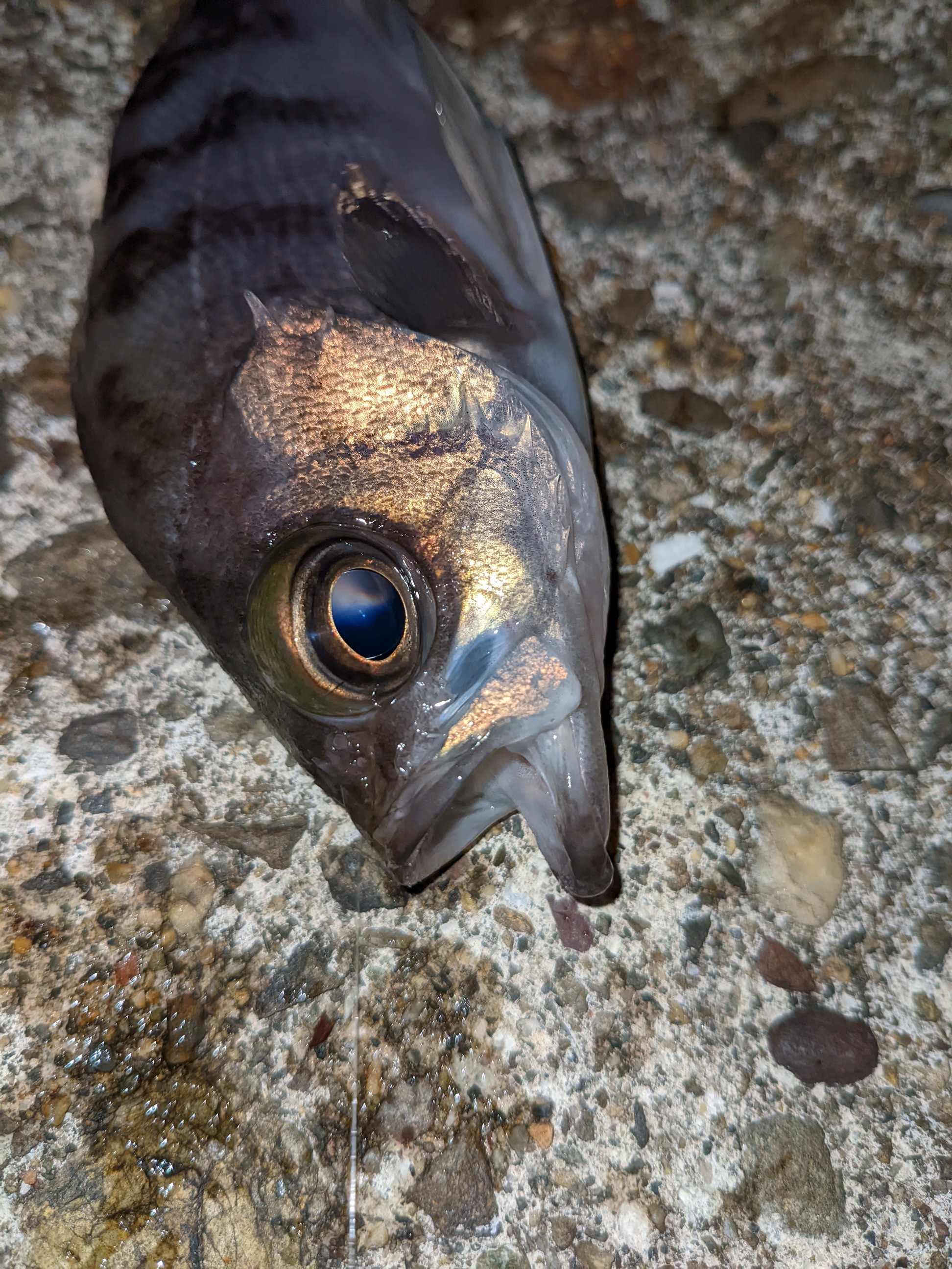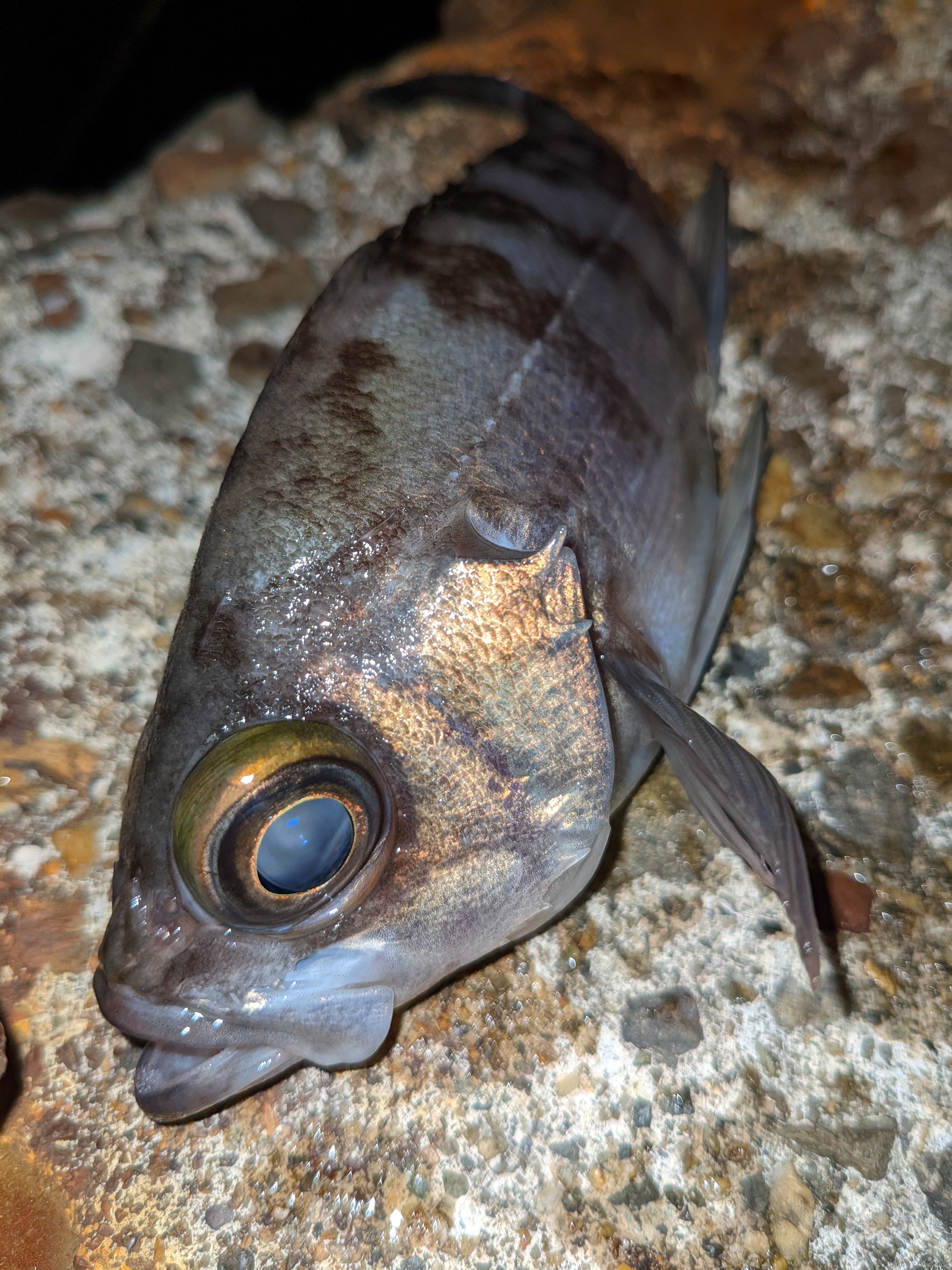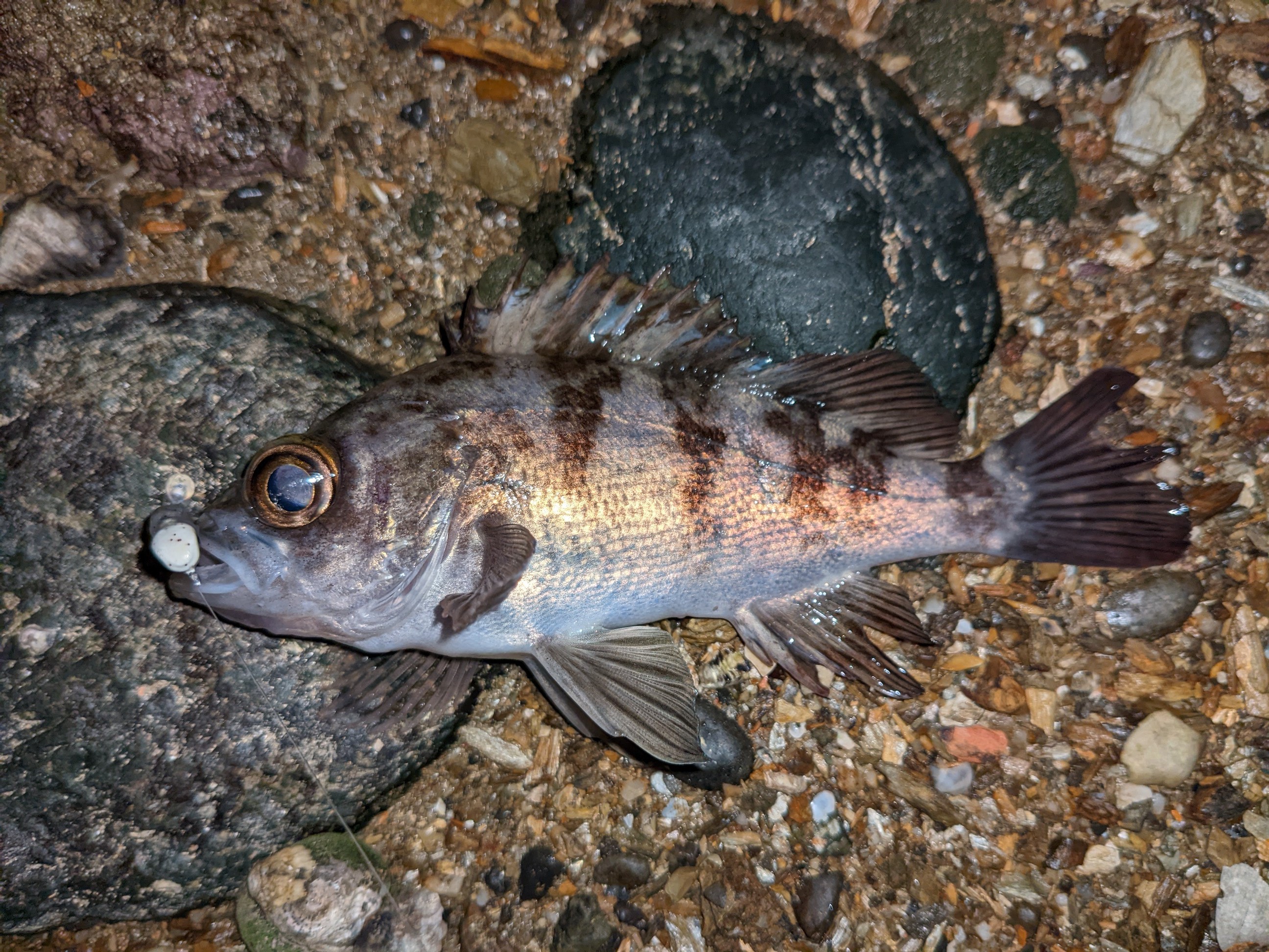 現場到着23時半ごろ。潮が引ききって少し上がってきたか、というタイミング。数投目に令和3年最後のメバルをGET。15センチ…