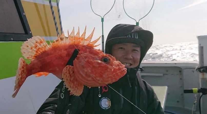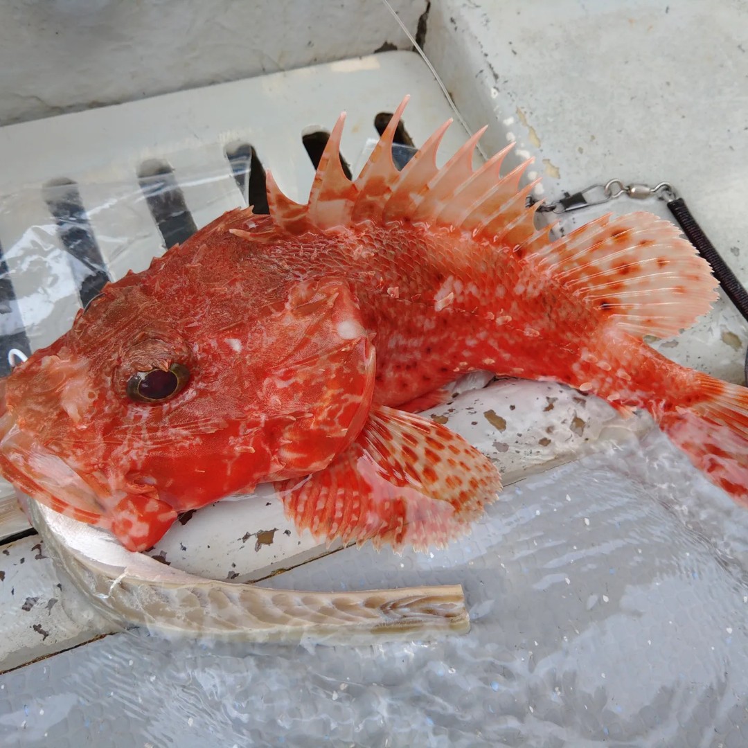 国崎漁港の宏漁丸様にお世話になりオニカサゴ釣りに行ってきました!1時間ぐらい走って志摩沖へ!沖へ出るとうねり&強風…水深150m、船長指示でオモリ200号でスタート。アタリ出ますが、食い込まない?全員苦戦しながらもポツポツ真っ赤なオニカサゴが上がり始めます!私もなんとかファーストキャッチ!渋い時間に船長指示でサバの切身に変えましたが、これが良かった!周りもよく当たりだしました。2枚潮で船中オマツリの連続でしたが、昼頃潮も落ち着きアタリも増えました。なんとかオニカサゴ5匹、ハチビキの釣果でした!激ウマのオニカサゴ釣りぜひ行ってみてください!