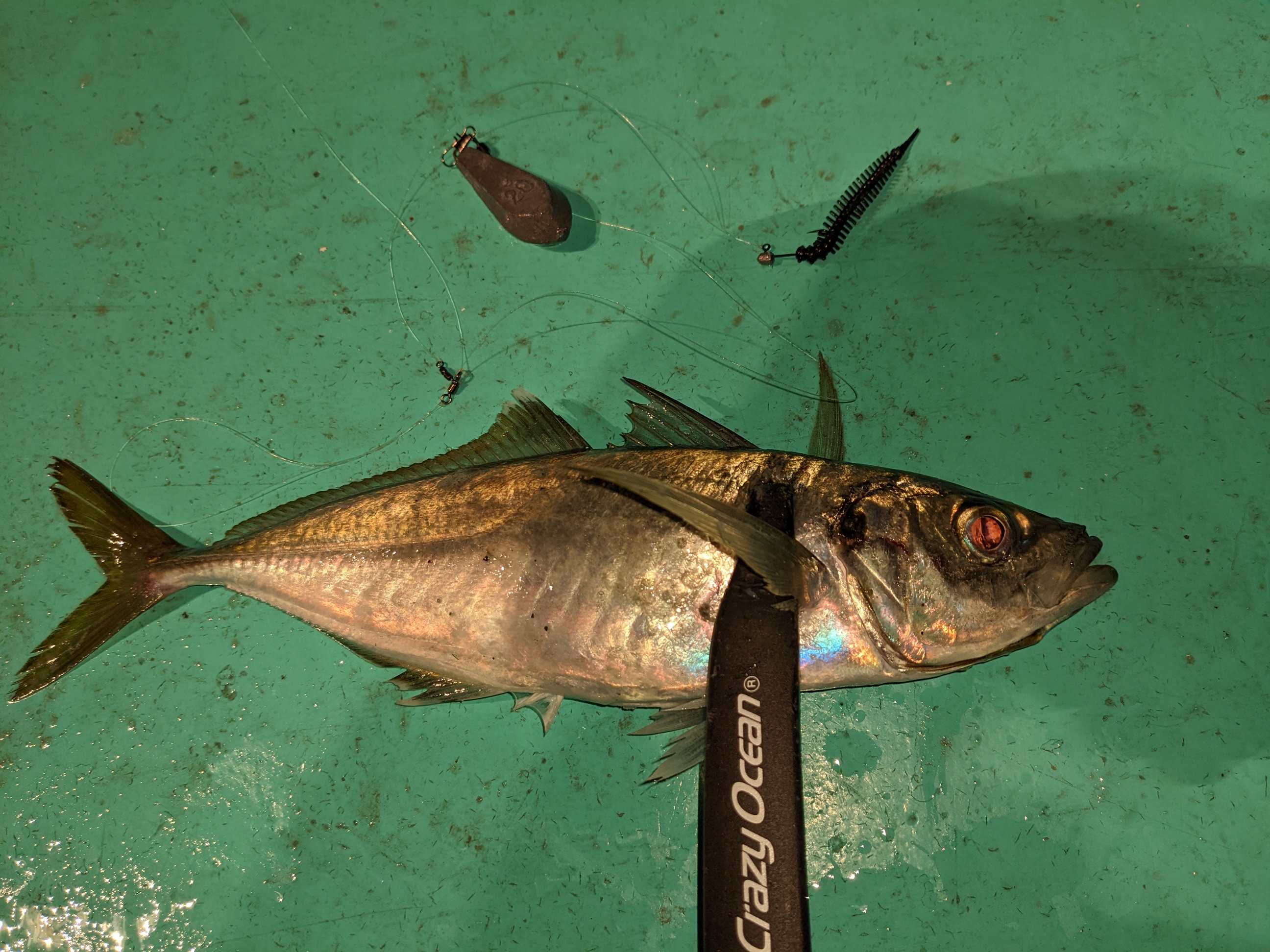 小さく押さえ込むアタリをあわせるとガンガン穂先を叩いて上がってきたのは尺オーバーのアジ。