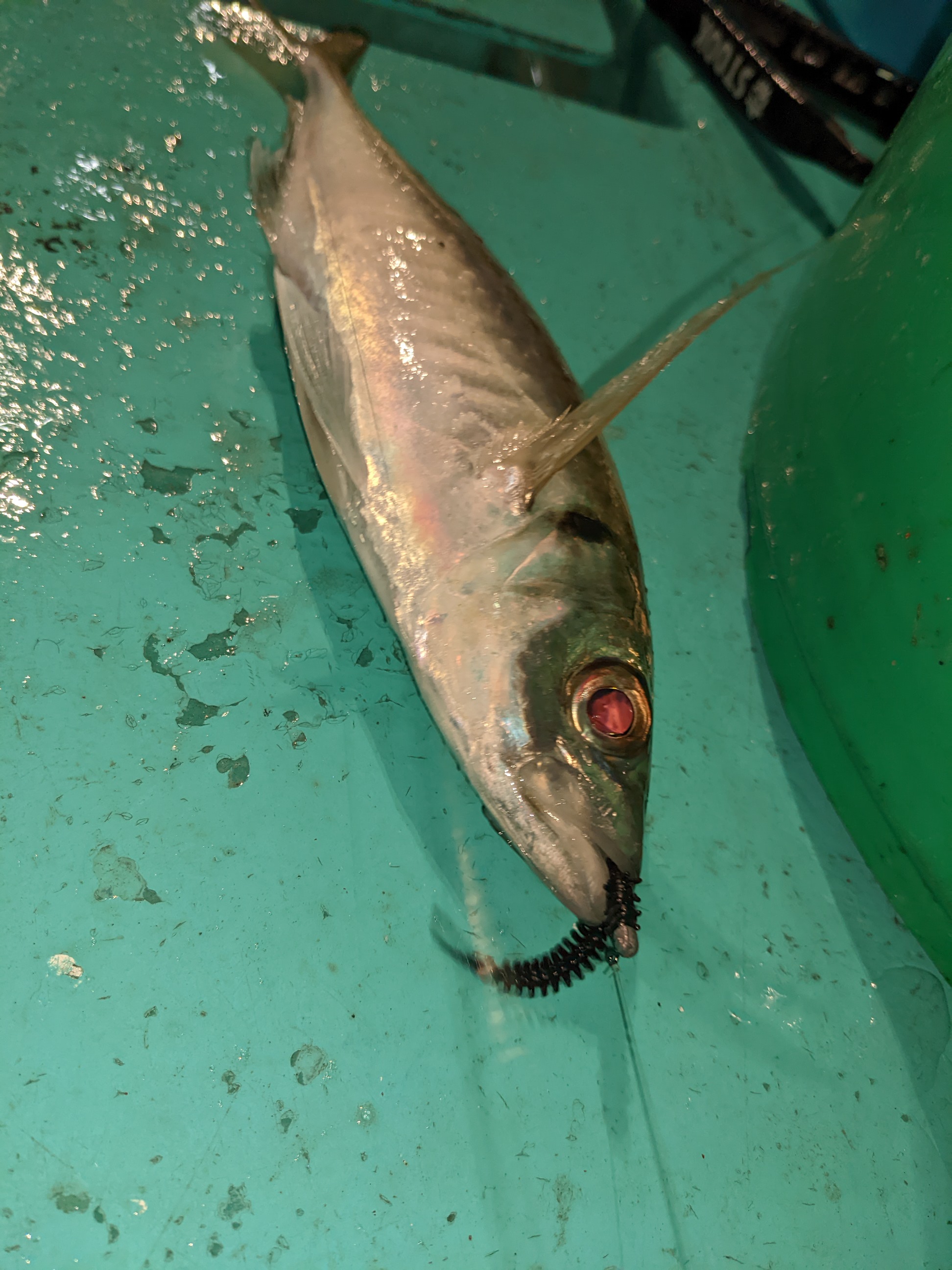 一匹を皮切りに周りもポツリポツリと釣り始め、船の明かりにも小魚が。