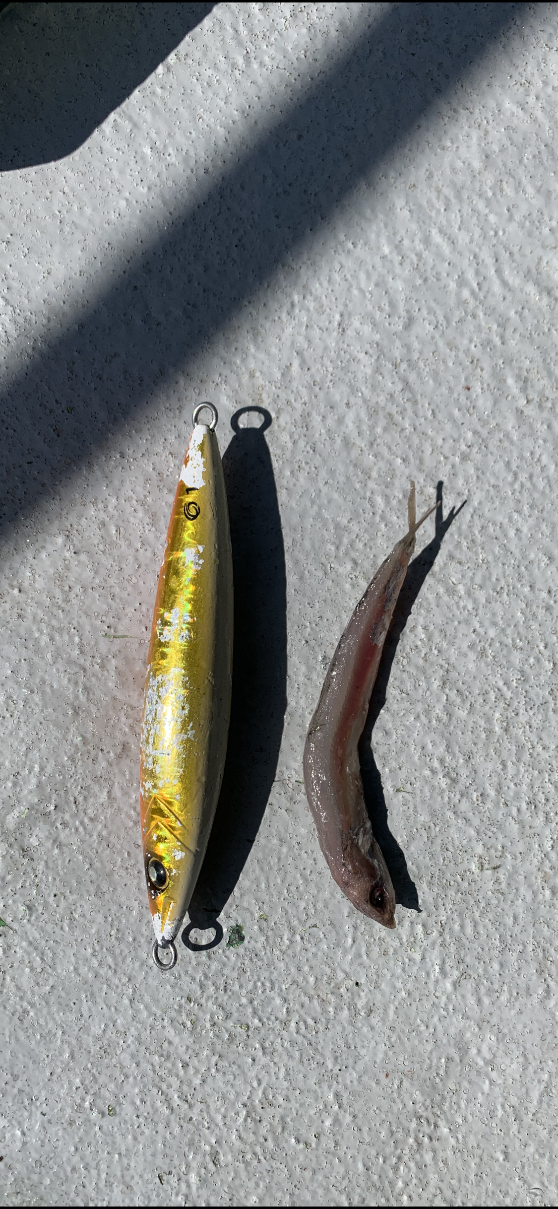 ベイトは15センチほどのカタクチイワシでお腹パンパンに入っていました。私はメタボスイマー160gオレンジ金がハマり連続ヒット!メタボスイマーは一口サイズなので食わせやすかったですね。朝のジアイが落ち着き、潮が変わるとまたまた魚探が好反応!少しパターンも変わりしっかりフォールを見せてやるとバタバタとヒット!ジグはクレイジーオーシャンより秋頃発売予定?のフォール重視設計のプロトジグ210gシルバーが絶好調でした。