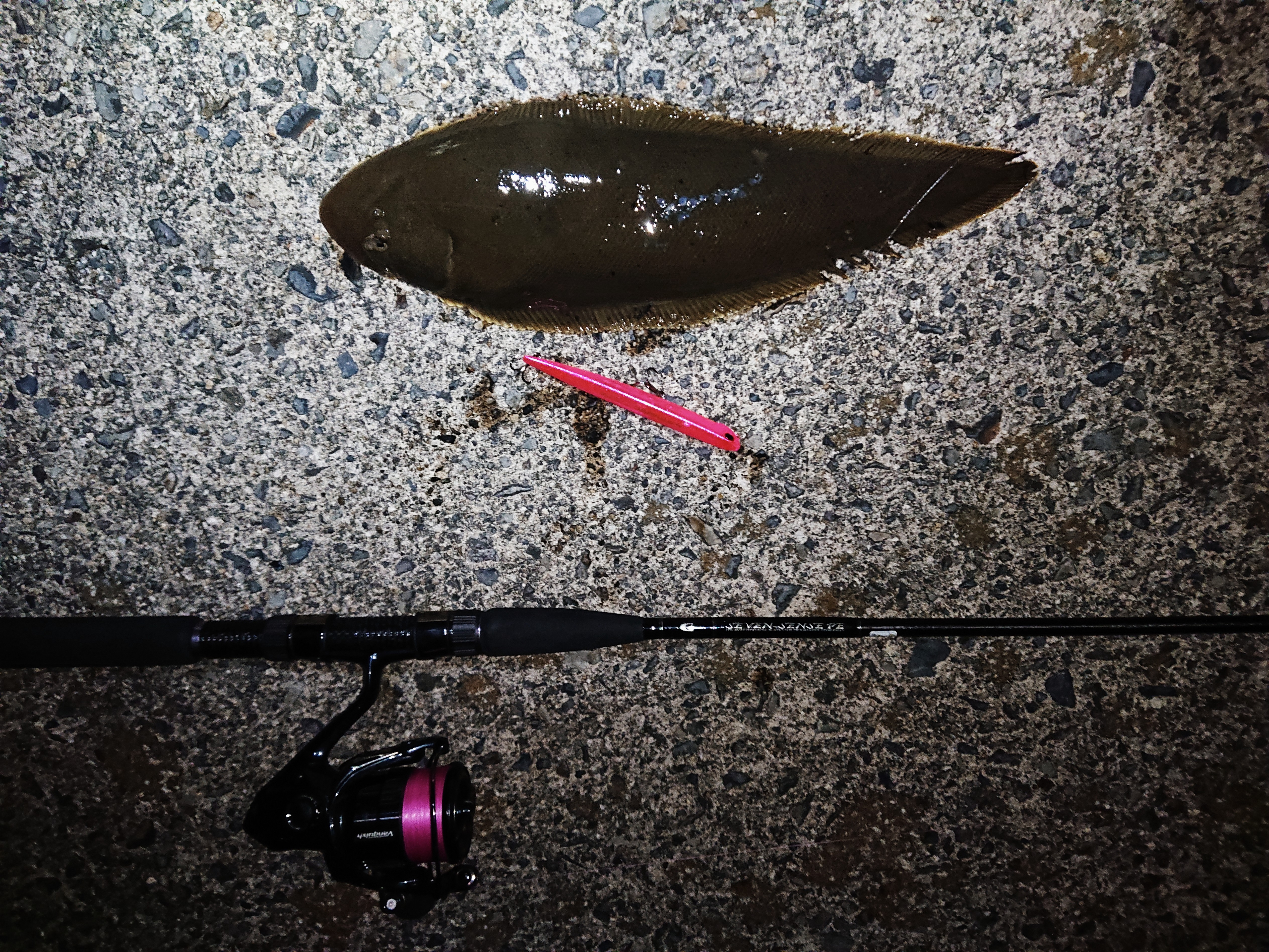 鈴鹿周辺にシーバス釣りにいってきました!周辺の漁港を右往左往してましたが、途中で底付近にバチが抜けているようだと確認してました。到着時には、干潮一歩手前でしたが、とりあえず底をとってから引きずらない程度にマニック115を巻いてくるゴツっとアタリが!エラ洗いもしないので、まさかのエイかな?とゆっくり巻いてくると今シーズン初のマゴチでした!昨日から少しずつ温かくなっていたので、近くにきたのでしょうか?その後、同じ所にもう一度キャストしてルアーが着底した所でまたヒット!あがってきたのは、シタビラメでした。その後は何も反応なく納竿しました。温かくなってきたので、暖かくなりやすい浅場のサーフは釣果が期待できるかもしれないです!