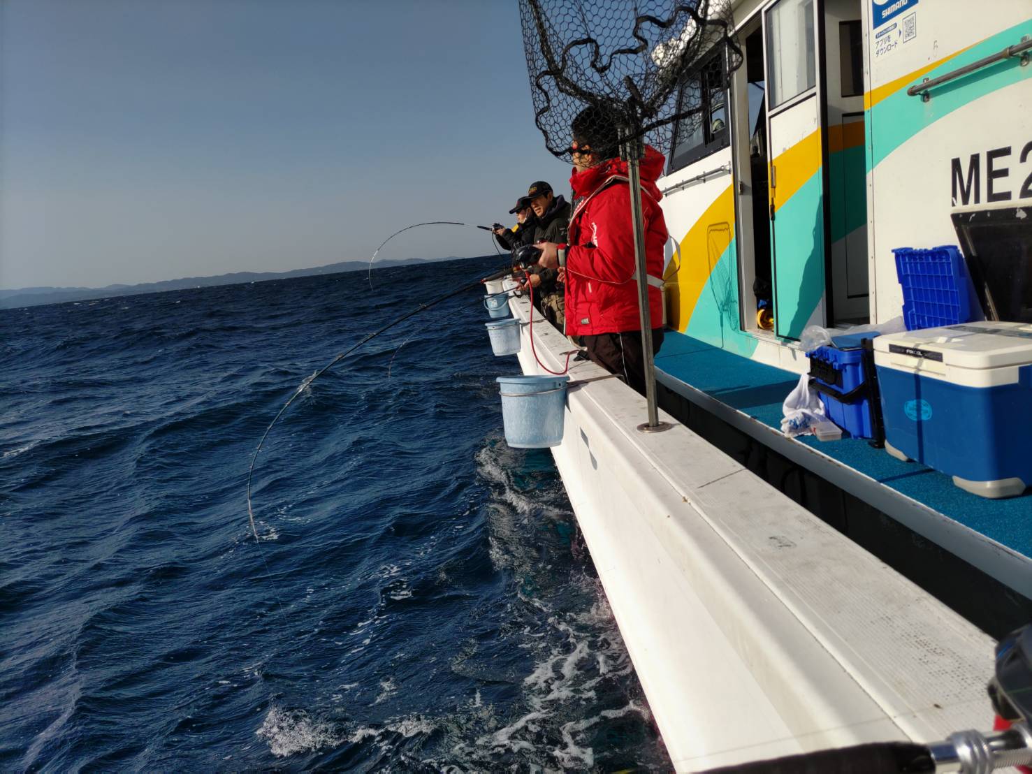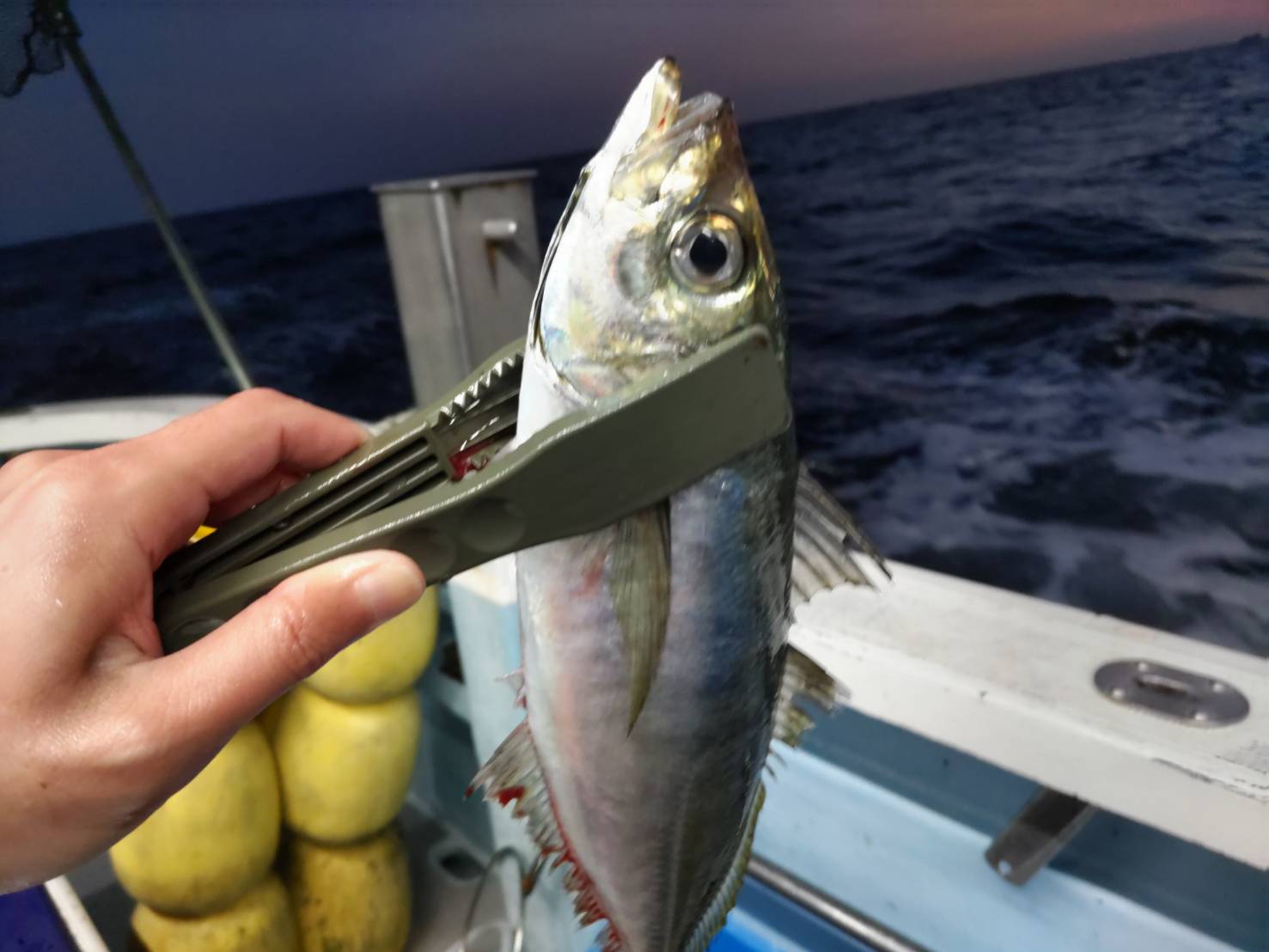国崎の勝丸さんで大アジ釣りに行って来ました!ポイント到着直後から船中いたるところで竿が曲がりこれは爆釣の予感!?しかしヤツは突然やってきました。サバフグの猛攻です。針を切っていくだけでなく高切れも続出。仕掛けだけでなく天秤やカゴ、オモリの予備はいつも以上に必要です。サバフグの猛攻に耐えきれずにポイント移動。最初のポイントほどの活性のいい群れではありませんがポツポツと良型アジが釣れました!40cmクラスも釣れて十分楽しめた釣行となりました!みなさんも国崎の勝丸さんで大アジ釣りを楽しんでください!仕掛けやオモリ、天秤、カゴの予備をお忘れなく!
