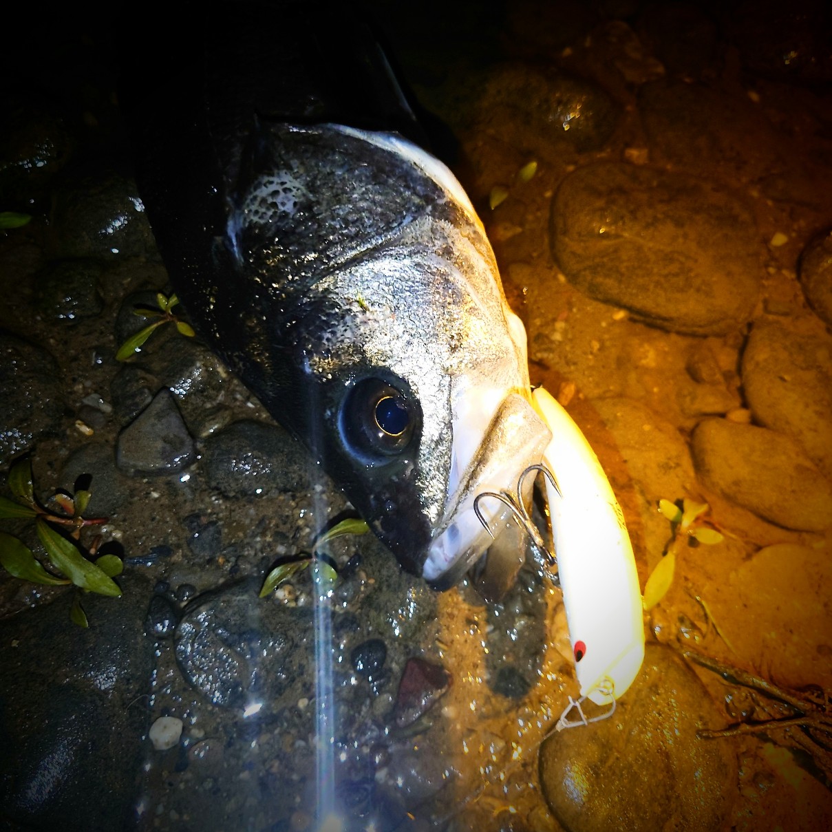 今夜はちょっと小規模河川にエリアを変えて釣行しました。水はクリアな感じで明暗がところどころにあるのでカラーを迷いながらセオリー通りで反応が得られず苦しんでいました。追われているベイトは20㎝前後なので…、大きめのアクションで12㎝のフローティングミノーをキャストしてみますが…反応ナシ。流れがキツくなり始めたのを機会に発想をチェンジ!90㎜のタックルハウスのリップレスミノーのナチュラルカラーに変更です!微かな反応は出ましたが…次の手は同じタイプでカラーのみパール系にチェンジ、キャスト!一発でヒット♪気持ちイイ!今夜はこれで帰宅します。