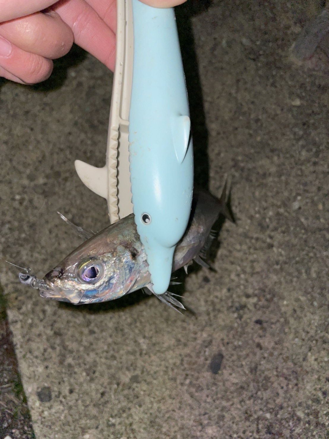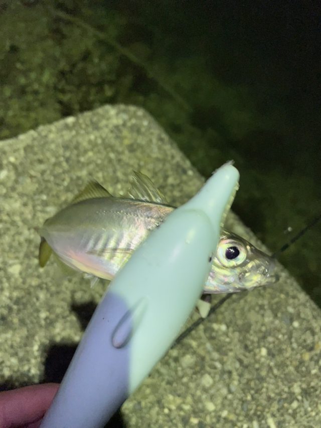 少し歩いてアジを探します。常夜灯周りをどんどん狙っていくと足元にめっちゃアジおる!ワームを落とすとすぐに反応しますが喰いはしない。
