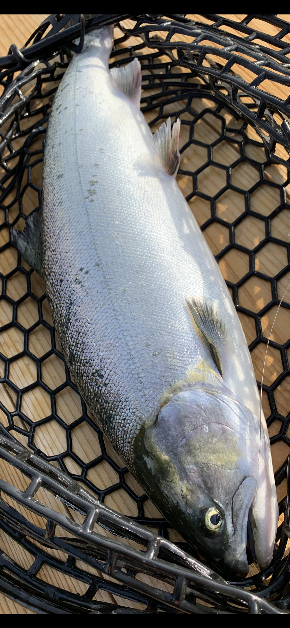 当日も人気で満員状態でした。まずは朝一,セオリー通りウキ釣りの同行者にマダイがヒット!自分は最近流行りの虫ヘッドパワーやボリーを使ってルアー竿で脈釣りを試みます。狙い通りフォールでアタリ!アワセのタイミングが難しい!竿先を押さえ込んだら大アワセ!慎重にやり取りするとなんと美味し嬉しいサクラマスをゲット!エサはマダイイエローのダンゴ。
