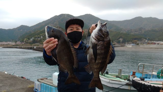 荒れ模様ですぐ場所変わってもらうかもとの事だったので、初めから湾内の穏やかな磯に渡してもらいました。コッパやエサ取りに苦労しそう…と思ったら、なかなかエサも取られずサシエが丸残り…ながーく仕掛を沈めていくとたまにベラやミニカサゴ…しかし少ないアタリを乗せていくと良型のチヌをゲット出来ました!!同行者もチヌ52cm頭に良型ばかりを3枚!なんとか形になりました!!