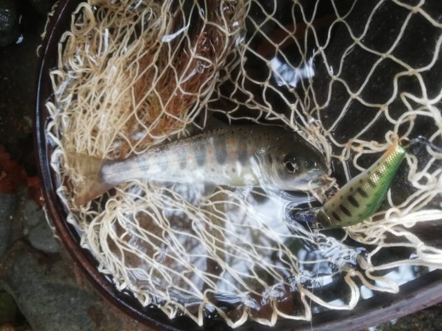 流芯の側をゆっくりアクションさせると早々にヒット!かわいいサイズでしたが綺麗なアマゴが釣れました。ヒットルアーはティムコさんのイメル50S。流れの中でもしっかりアクションできるのでオススメです。