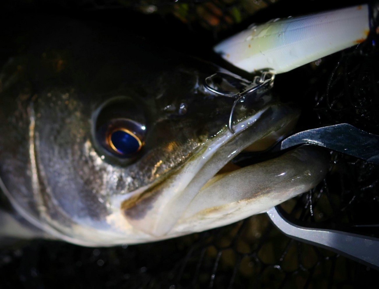本日のシーバスはサイズこそ60クラスでしたがバイトもハッキリした『ガツン!』という感じでヒット後も相当に激しいファイトで、元気の良い回遊タイプでした。このポイントは大潮の下げ潮2分あたりは流れが最速になります、速い流れが大好きなシーバスは高活性になっていてヤル気マンマンです!正確にフィーディングレーンを流してあげればほぼヒットに持ち込める感じです。ヒットルアーは128㎜のフローティングシャローミノーのパール系に反応してくれました。