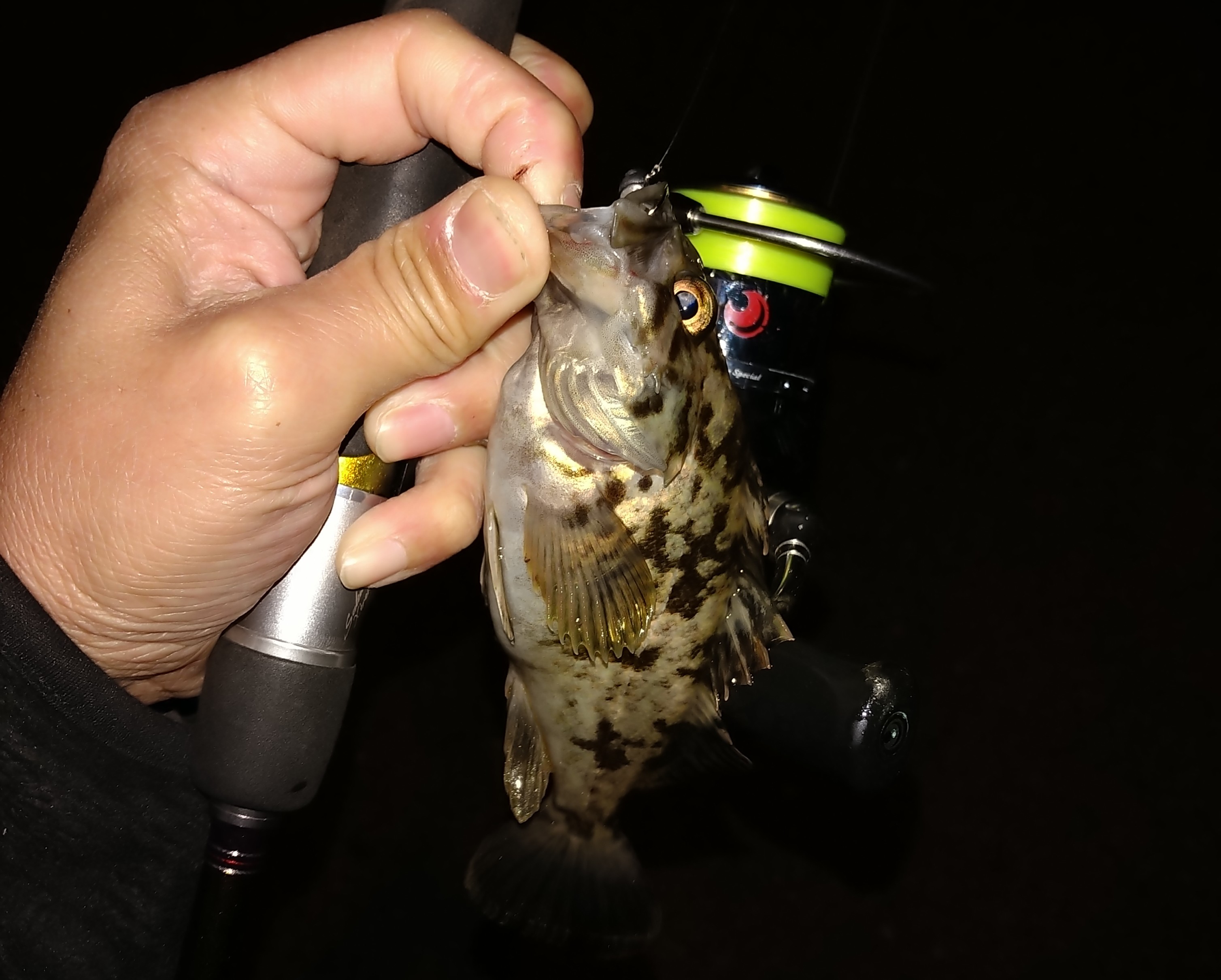 仕事終わりに再びメバル調査に行って来ました!短時間勝負です!風が強いのは分かっていましたが…現地に着くと爆風です…。とりあえず竿を出します!ジグヘッドは、1.5gでワームはスクリューテールです!波もあり、少し濁りもあり…風でラインが取られ釣りずらいので少しでも風の受けにくいコースを探して釣って行くと…何とかタケノコメバルが2匹釣れましたが寒すぎて約20分で撤収しました!今回もメバルは釣れませんでした>.<それでも短時間でしたが楽しめたので良しとします(^^)
