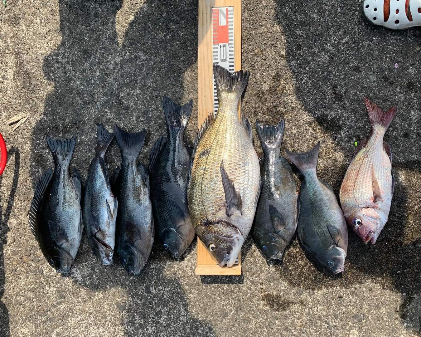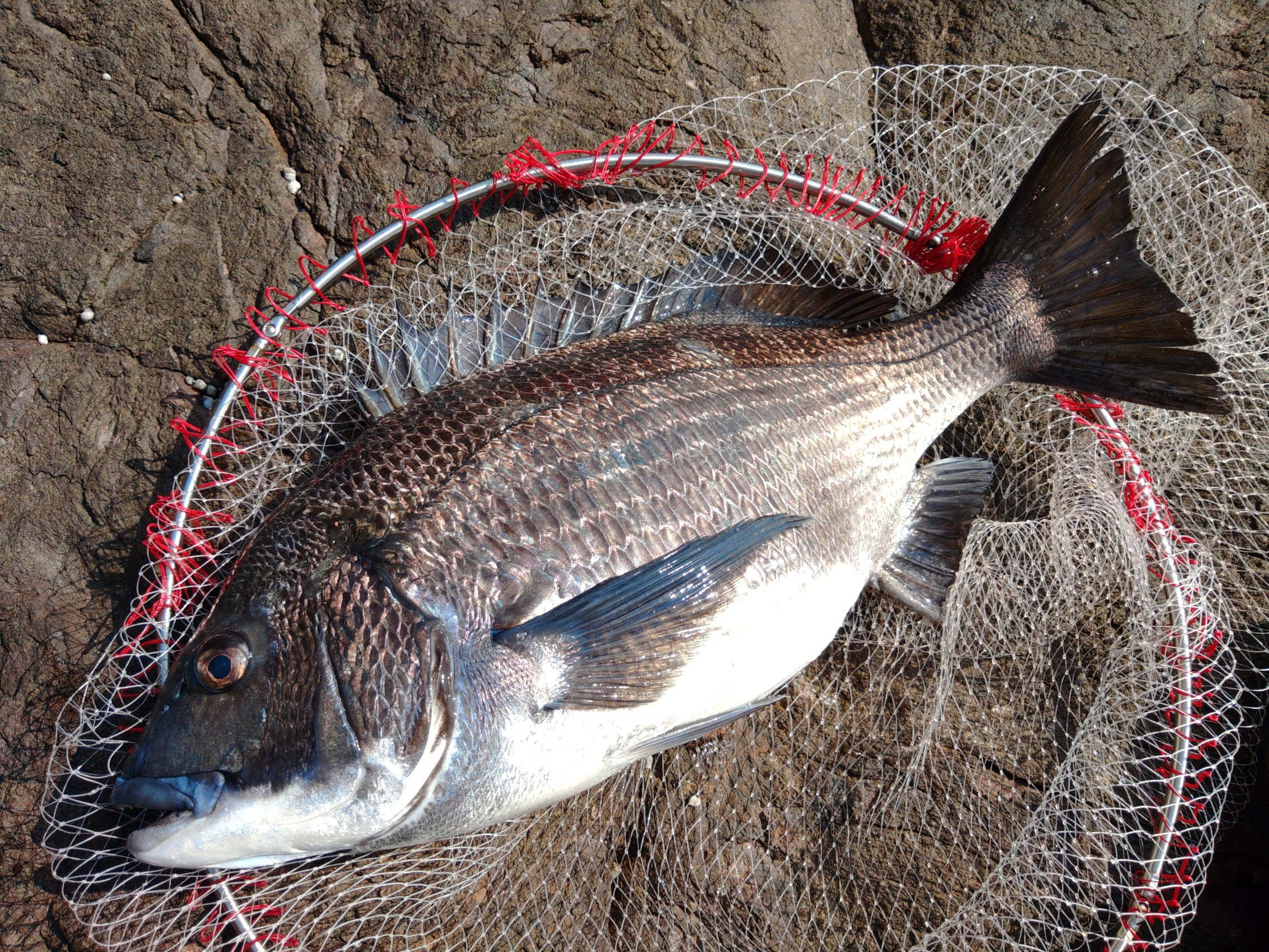 渡してもらった磯は鈴島のマツノセです。ちょっと波気があり、サラシもいい感じで出ています。さっそく準備して投入しますが、サシエ丸残りの連続…この時期は甘くないよなーと思いながらも続けているとヒット!40弱の口太!そこからポンポンと40前後が釣れますが、しばらくするとフグやアイゴが連発!チヌも45㎝ぐらいのが混じります。そんな中サラシから外れたところを深めに入れていくとドン!スピード感は無いもののなかなか止まってくれず&浮いてこない!ゆっくり寄せてきて浮いてびっくりの巨大なチヌ!港計測で55㎝の肉厚な魚体でした!しばらくアイゴ・チヌ・マダイ・子尾長など賑やかな魚が続きますが、11時半ごろから再び時合!毎投サシエが盗られ(アタリが小さくて掛けきれません…)35㎝ぐらいが連発するように!マキエも底を尽きかけたときにはこの日最大の45㎝をゲット!そんなところで良い時間になったので終了しました。