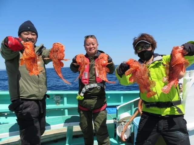 久しぶりに御座の智栄丸さんへ鬼カサゴ釣りに行ってきました。当日は乗合いでしたが自分達3人でのゆったり釣行!いつも通りポイントまでは20分 水深130メートルからスタート!開始早々みんなの竿に反応があるがリリースサイズの小カサゴの猛攻!開始2時間で5匹リリース。同行したTさんは40UPをコンスタントに釣り上げるが自分には子鬼ばかり・・・ポイントを150メートル160メートルと深場に移動すると自分にも良いサイズの鬼カサゴが!プチ時合スタートです。それまで釣れずに口の少なかったMさんの40UPをポツポツ釣り笑顔!そのまま終了時間まで何だかんだ釣れ終わってみればカンコの中が真っ赤に!最高の釣行となりました。