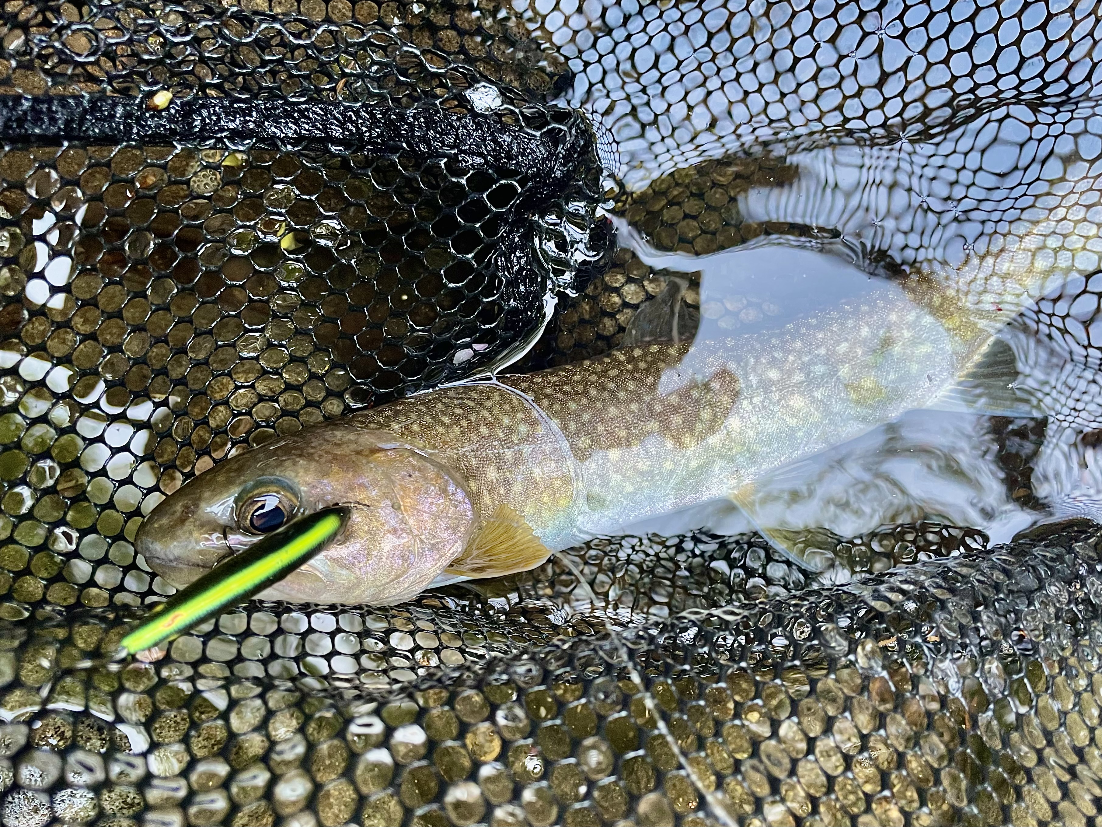 最近渋めなので、いつもより奥地のポイントを選択。初っ端から小型のトラウトのチェイスを複数確認しましたが、なかなかヒットせず…。Dコンタクトのややナチュラル目なカラーに変更して、見切られないように早めのアクションに切り替えるとすぐヒット!綺麗なイワナが来てくれました!
