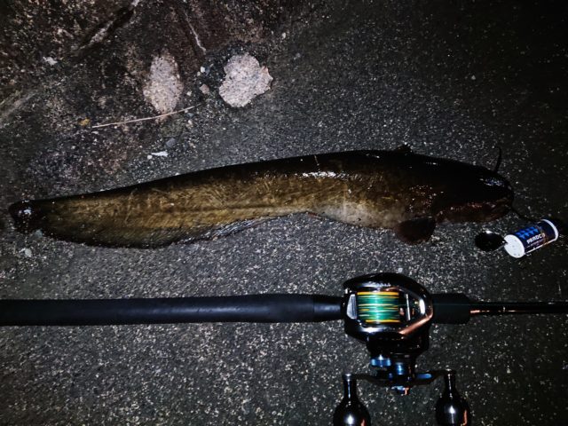 ヘドンルアーで鯰ゲームをしました。持って行ったルアーは、ビッグバド、クレイジークローラーの2つのみ!夜にやっているので、ケミ蛍25を輪ゴムでくくりつけました。(ケミホタルがあると視認性がよくなり、障害物の際に着水させやすいです。)まずは、近くの用水路からスタートしました。そのまま川上にのぼりながらナマズを探していきます。雨が2日前だったためか濁りが全くなくこれは駄目ろうなぁーと思っていましたが、用水路の橋下にダウンに流していって巻きはじめ3巻きで、ビックバドの金属が跳ねる音が!おもいっきり巻き合わせそのままランディング。メジャーを持っていってなかった為どのくらいの大きさなのかわかりませんでしたが、大きそうな鯰でした!只今、シーズンのナマズ。好きなトップウォーターで釣りやすい魚かと思います。梅雨の時期になりますと、マムシ等の毒蛇、ムカデ、毛虫など多くでてきますので、長袖、長ズボンで、長靴なども必要かもしれません。周りも民家が多い場所もありますので、駐車や迷惑のかからないように静かに楽しみましょう!