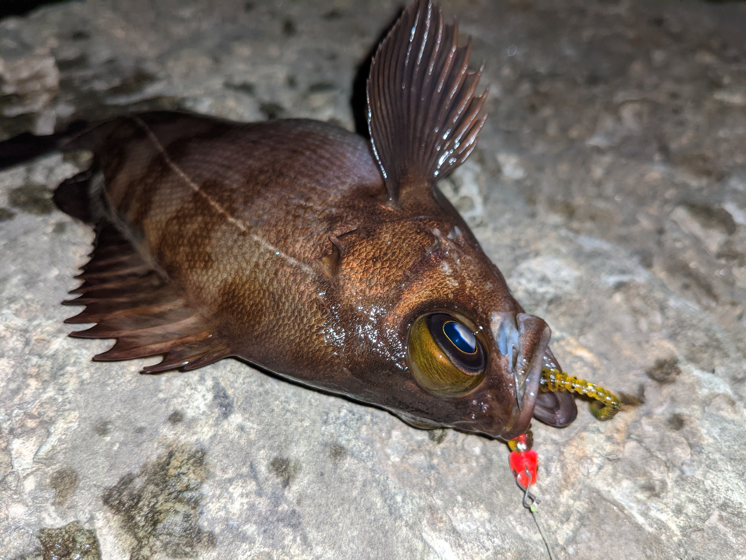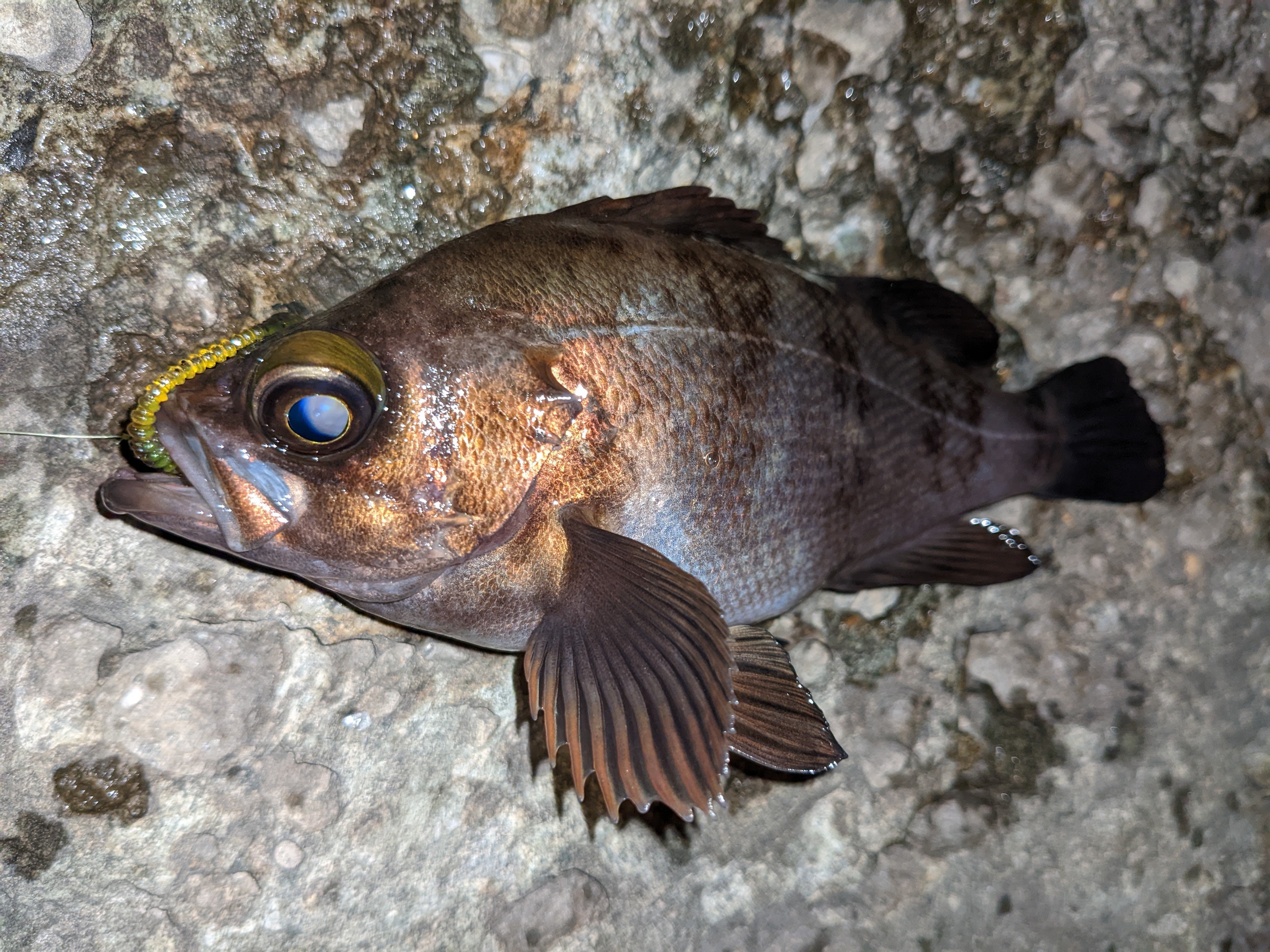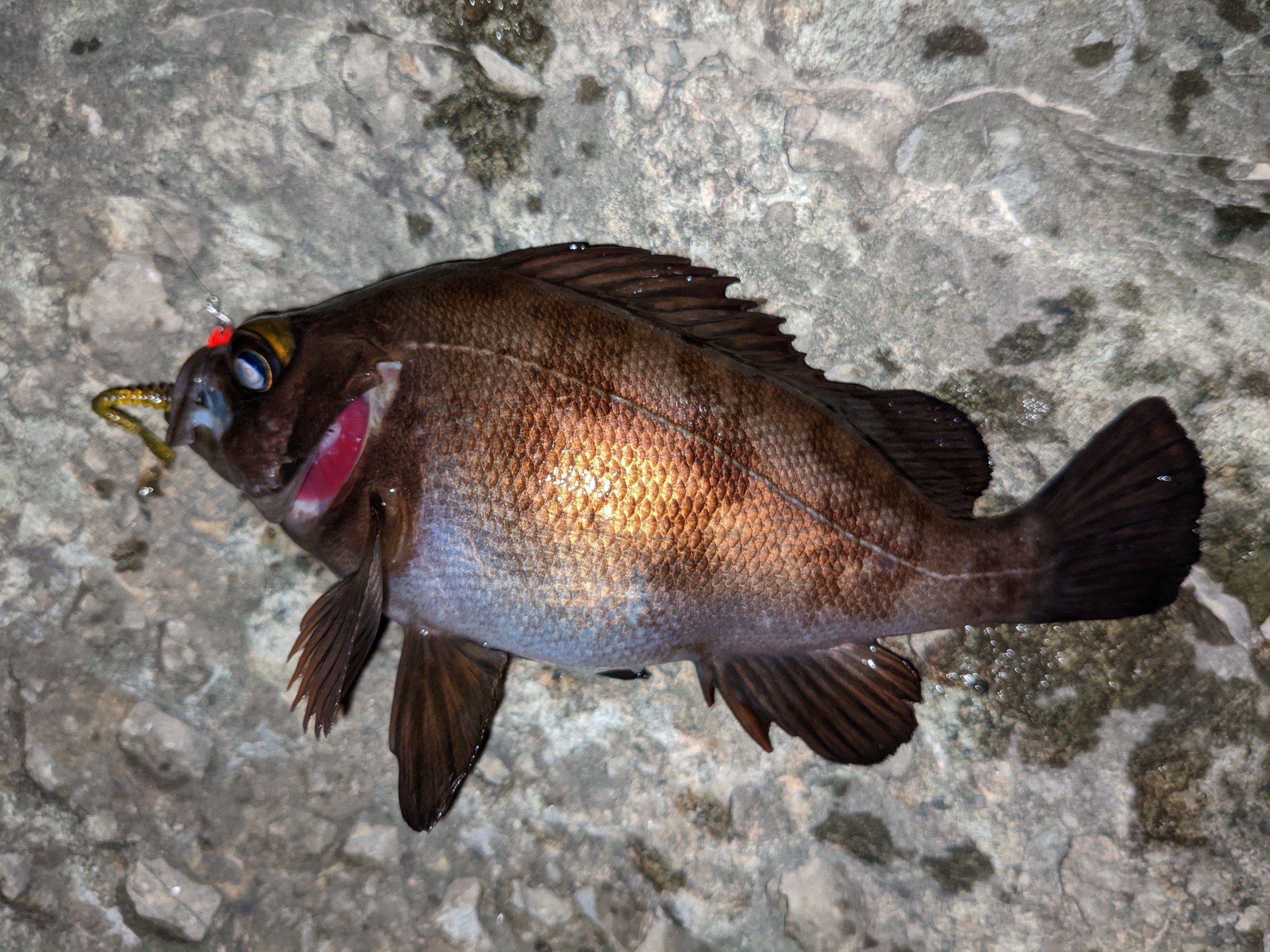 もうそろそろメバリングも終盤。チヌやらシーバスやらが待っている?ので最後の予定でメバリング。
