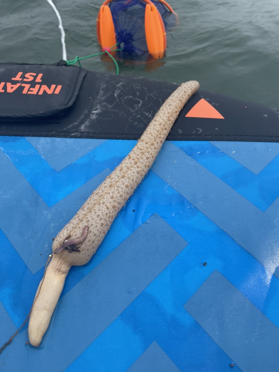 ポイントは水深3m程。ちょい投げ仕掛けにイシゴカイを付けて底をゆっくり引いてくるとヒット!20cmほどの良型キス!