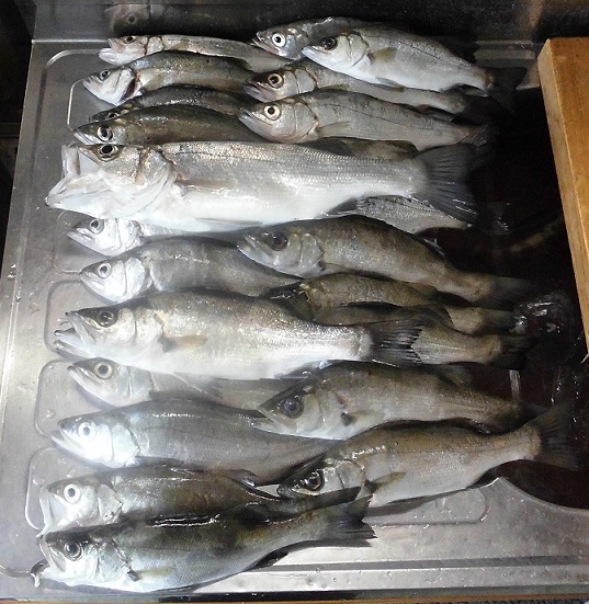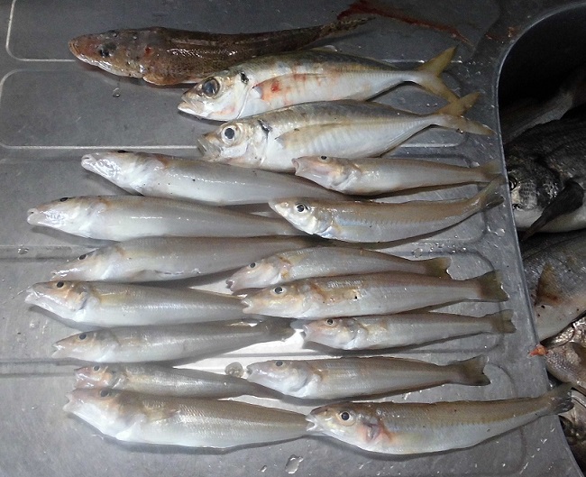 明け方前から休憩して昼間の釣りでキスを狙いますがボツボツ釣るのがやっと、キビレ小を追加し次に回収巻きにヒットしたのがヒラセイゴ中でした。アジも1匹追加して休憩です。