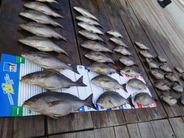 今シーズン初のSLJはFP志摩(フィッシングポイント志摩)さんへ釣行しました。最高の天気といい感じの風具合、潮は激流&スケスケ、鳥山はほとんど無しの状況でした。この状況は良いのか?悪いのか?わからないですが潮が良く効いているはいい感じです。当日はタングステンジグの25g30g、TGベイト、トウキチロー、メタルブレードを使用しました。ポイントは水深5m~15mキャストして1~5秒カウント(状況におうじて)して沈めてからリールを6~8回巻き、ストップを入れます。そのストップを入れたり巻きはじめたりするタイミングで「ガツン」とイサキがアタックしてきます。沈黙の時間もありましたが朝から最後まで、ポツポツアタリイサキは11匹でした。谷口船長は教えてくれるし、釣らせてくれます。また釣れた魚は締めてくれるので釣人は釣りに集中できます。アワセミスやフックオフも多いのも悩むし面白いところ。(フックはリアフックのみ)イサキは脂のりのりの美味しい魚体ばかりです。早く釣りに行きましょう。今期のSLJはミドル便のみ(早朝から3時までミッチリできます料金は13500円)