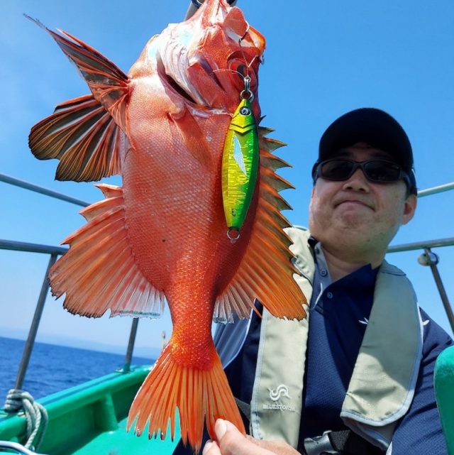 後半になって同船していたクレイジーオーシャンの仲さんに、大きな当たりスロージギングでマハタの62㎝ゲットしていました。