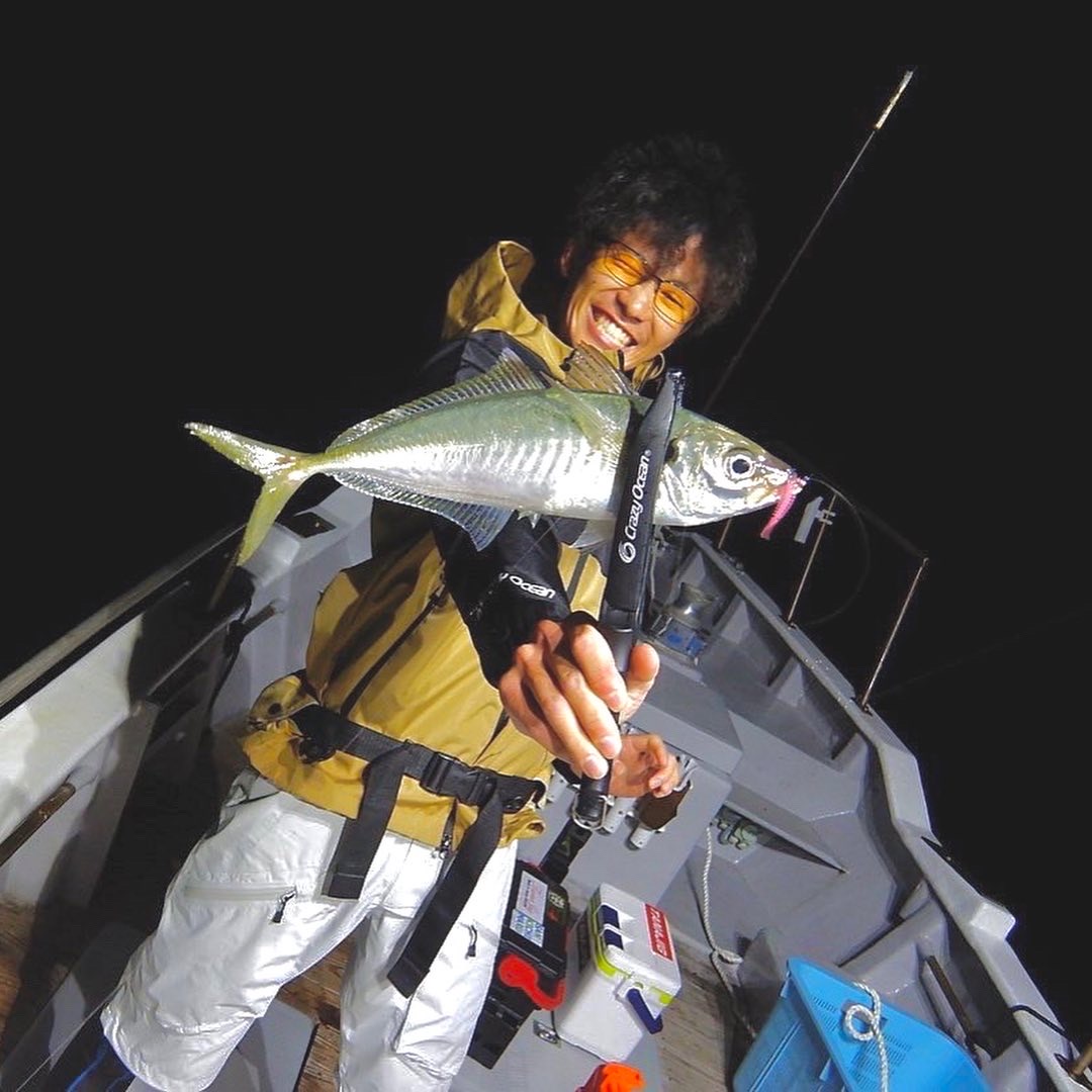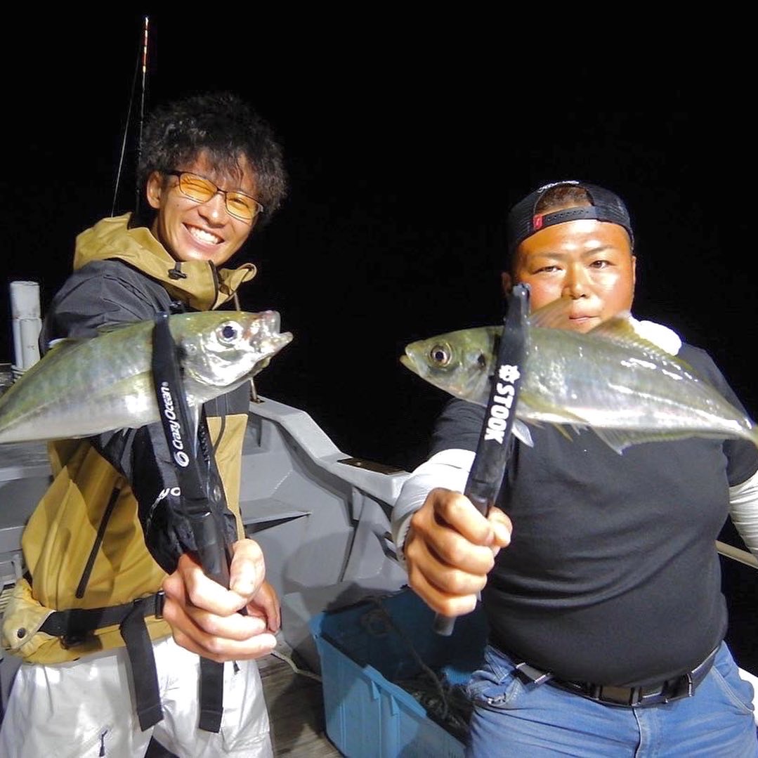 船のライトが効き始めると、フォール中に底べったりでアジヒット!30㎝後半の良型!ヒットする棚が時々中層になったりするので、カウンターリールは必須です!あと、ディープアジングには、クレイジーオーシャンの海毛虫の「ピンクグロー」がよくアタリますよ!!新しく出た、海毛虫カーリーでもアジきました!アピールさせたい時は海毛虫カーリー!ジアイに入ると、ダブルヒットやトリプルヒットも!