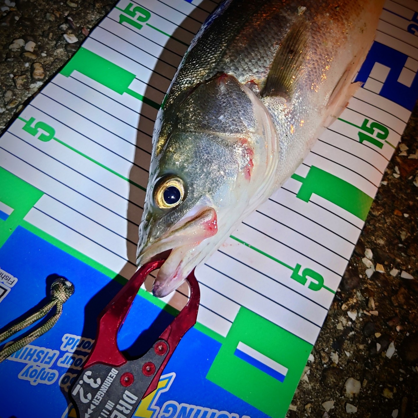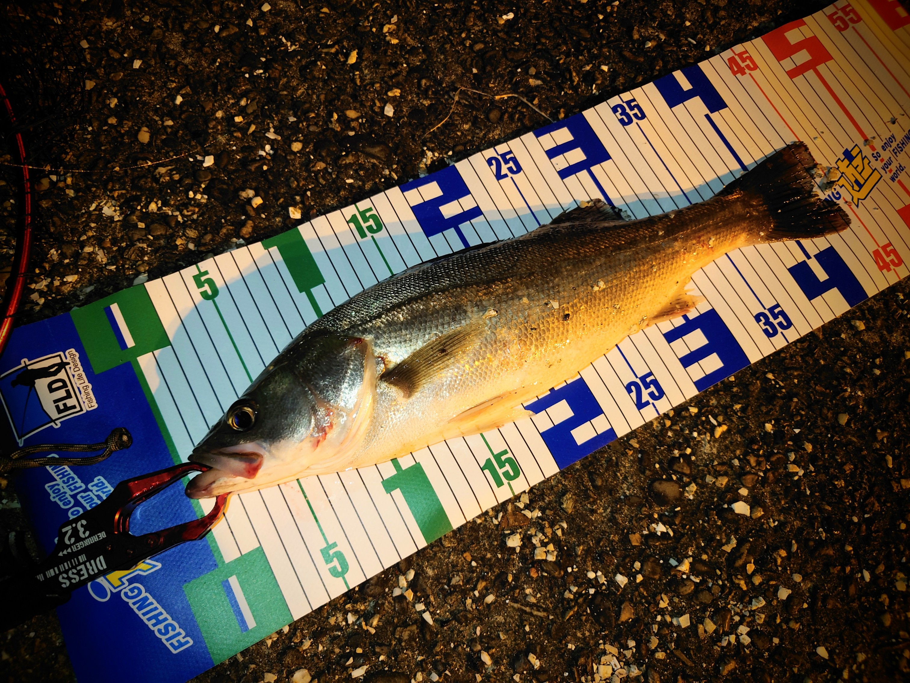 とりあえずポイントに到着したのでタックルを持たずに状況を観察していると…、大量のベイトにシーバスが時折突進して水面爆発!慌ててタックルを準備してキャスト!しかし…、何度キャストしても反応してくれません…。ポイントを少しずらしてキャストした2投目に…、『ガツン!』とバイトしてくれました♪ サイズは大きくなさそうですが、ズゥーーーーっとジャンプ&テイルウォークを繰り返して抵抗を続けます、使用ルアーに付いているフックサイズは60ミリのフローティングミノーに合わせたフックなのでバレないか少し心配でしたが、ロッドが柔らかい為、難なくゲットできました。ULライトクラスのソルトロッドは小さ目のベイトを捕食している時に重宝します。