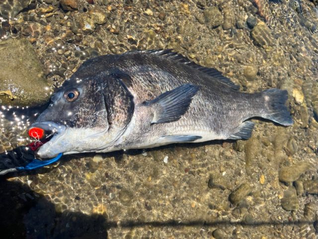 さあこの季節がやってきましたということで、チヌトップに行ってきました。水面炸裂、魚が追ってきてバイトまで見える面白い釣りです。しかしこの日は渋く、見えているチヌの上を倒してもスルー。下げ潮で川幅が狭くなって来たタイミングで背鰭が出そうな水深のシャローで待ち構えているチヌを発見。反応渋くドシャローなのでサイズの小さいガボッツ65を投げてチヌの目の前を通すとチェイス!追ってくるだけなのでアクションを入れてステイさせるとスポッっと吸い込んだ?ようなのでアワセを入れてフッキング!51cmの良型チヌでした。