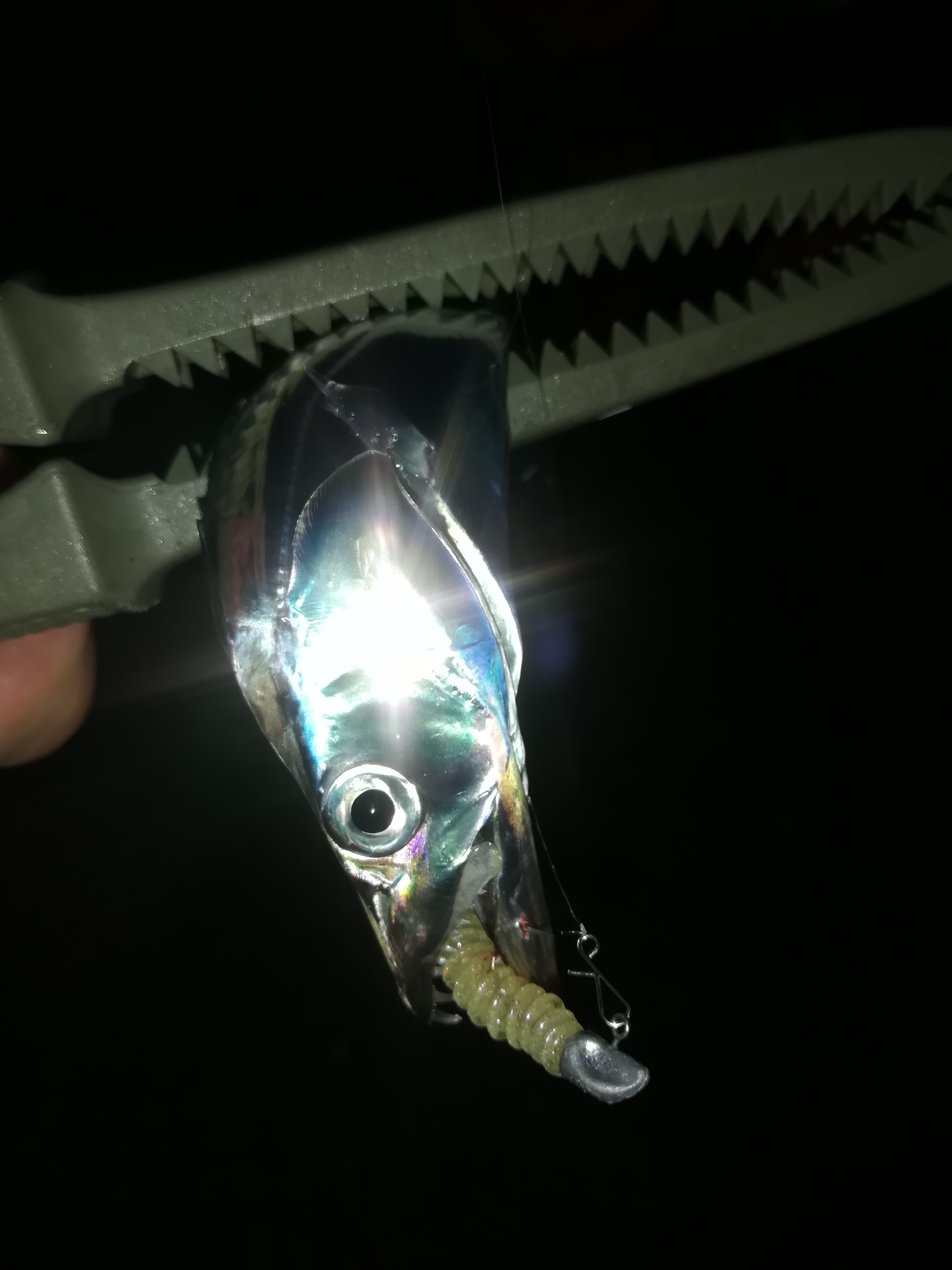 風が強くてやりにくかったですがアタリはちょこちょこあり、集魚灯に電気ウキの仕掛けで釣りをされている方はタチウオを次々と釣られていました。タチウオがいることはわかったので期待して続けますがなかなか乗らない。