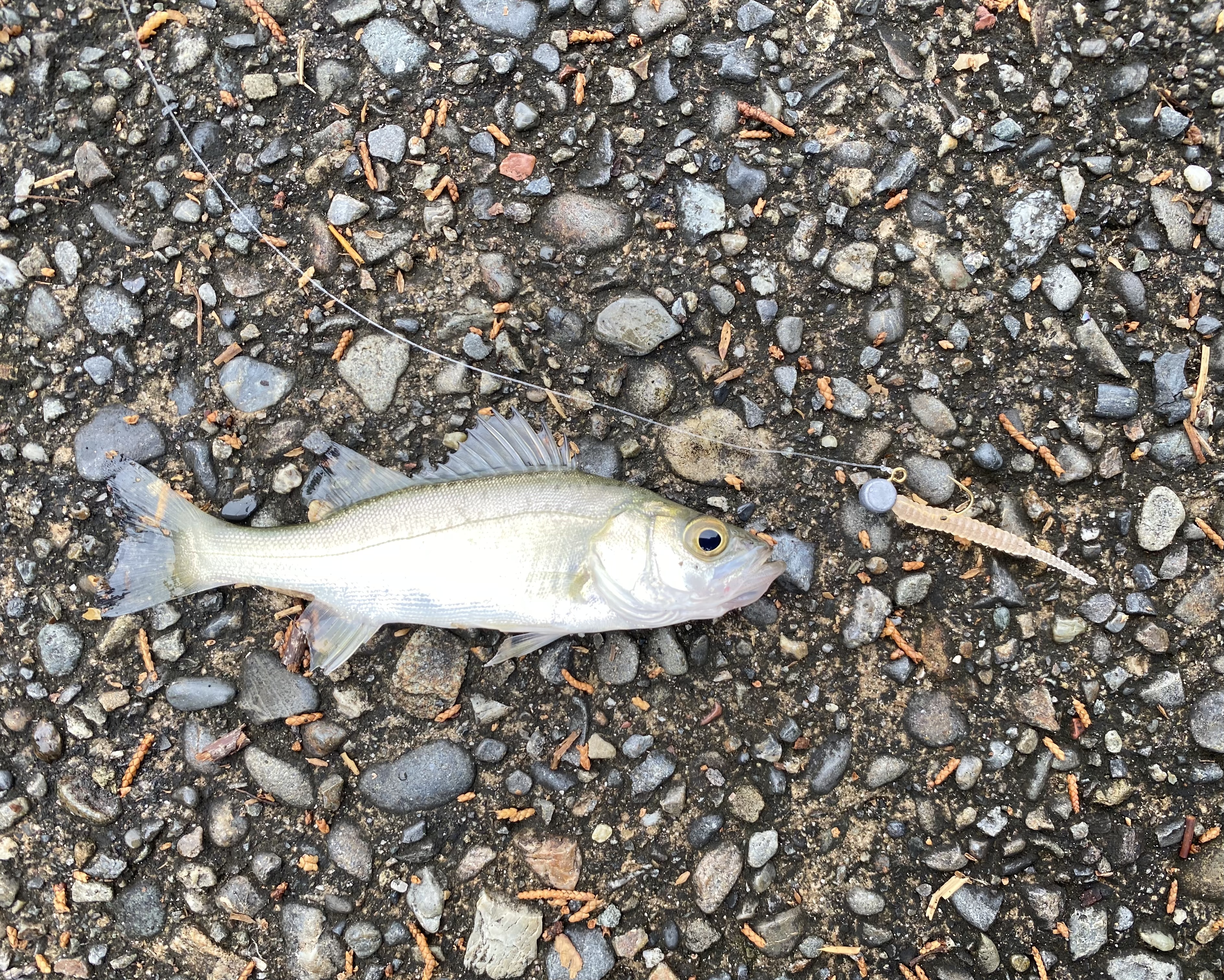 と思っていたら小魚のボイルが始まったので1グラムのジグヘッドにアジングワームをセットして表層を通すと極小サイズのセイゴ!