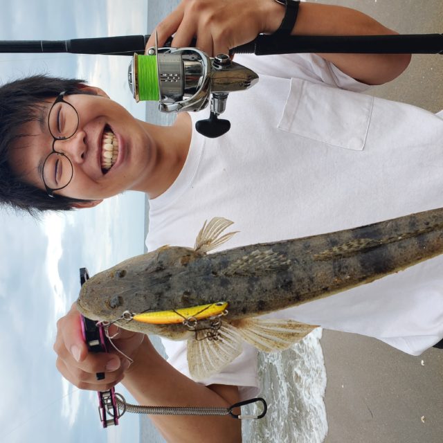 後輩の中野君と鈴鹿サーフへ行って来ました。サーフでの釣りは今回が2度目とのことで最初は鈴鹿サーフ実力No.1のフリッパー32gを付け、キャストしてもらいました。私もタックルの兼ね合いからフリッパーZ24gで始めます。周りのかたもちょこちょこ釣られていたので、これはこれは?と思っていましたが、なんと2投目で、中野君ヒット!小振りながらルアーで初めてのマゴチをかけておりました。私もあたふたしながらキャスト。リフト&フォールをかけながら巻いていると手前15m程でヒット。私もマゴチを釣りました。その後、中野君もまたヒット!慣れてきた様子です。私はそこからただ巻きに変更。キャスト後、ただ巻きから6巻きくらいでポン!というアタリがあるも乗らず、もう5巻きくらいでカツンという感触。を合わせるとなんとカレイ。その後は、リフト&フォールで探るとフォール中にアタリがありましたが、乗らず。その後、中野君は一匹マゴチを釣り上げ、今回は納竿しました。一時間程で、二人でマゴチ4匹、カレイ一匹の釣果でした。釣行の際は、マナーを守り、ライフジャケット等身につけて楽しみましょう!