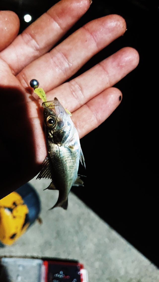 ライトゲームに近くの漁港へ行って来ました。ラインはPE0.25号にフロロ1号15センチ取り付けて、ジグヘッド0.8gに新製品、エコギアのアジ職人アジマストファット1.8インチで始めました!何かしら釣れたらラッキーと重いながら、足元にできている堤灯の影に平行にキャスト!からのフォールさせながらチョンチョン。(オノマトペばかりですみません。)ジグヘッドの重みで引いてくるように意識しながら誘ってみます。と、早速アタリが!あるも乗らない。そこから何度も同じ事を繰り返します。あれー?と足元をみるとなんと。沢山のミニマムセイゴ達が湧いていました。1.8インチのワーム2.5本分くらいのサイズばかり。これは、釣れないなと、早速ワームを半分にちぎる!笑もはや、邪道かもしれませんが、あの小さなセイゴを釣りたい!と思いながら投げること30分近く…