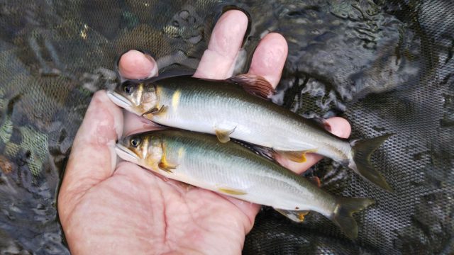 入川したのは中流域の清地地区、人気ポイントでいつも釣り人は絶えませんが、この日はなぜかお二人^o^かごやオトリ店さんで2尾のオトリ鮎を購入し、すぐ横の吊り橋上流から釣り開始。少しずつ下流へ移動しますが、なかなか1尾目が反応してくれません・・・30分経過した頃、大きな石の上流側へオトリ鮎を沈め、目印を立て気味に水中糸をスーっと張ると、待望のアタリ!これが16cmほどの1尾目となりましたが、その後なかなか続きません。。。少し下流で2尾目、また少し下流で3尾目、人気ポイント、そう易々とは掛かってくれません。16時過ぎ、左岸側から右岸に向かって斜めに流れるチャラ瀬に来ると、サッカーボール大ほどの石が揃い、薄い茶色から黄色味を帯びた、いかにも鮎が食んだ石が目立ちました。ここで下流側からゆっくり泳がせ、入れ掛かりとはならないまでも、ポツポツ掛かり続け、4時間で15~17cmほど16尾を数えることが出来ました。まだまだ興津川の鮎釣りシーズンは始まったばかりです!