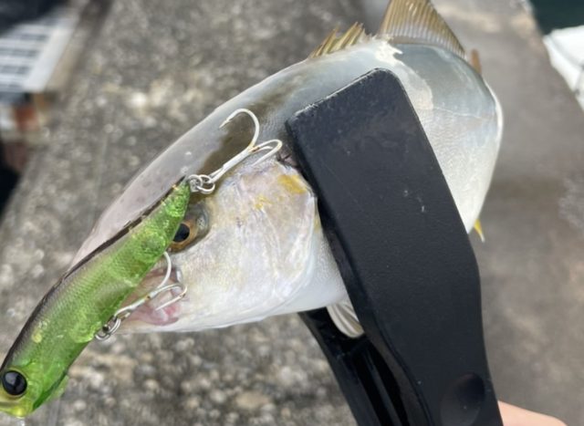 いつも通りにポッパーで誘うことに。投げ続けること数時間。沈んでいたベイトが急に浮いたので投げるとヒット!サイズは小さいですがなんとか釣れた。その後普段の1/5くらいのペースで喰ってきますが全てミスバイトに終わりこの1匹で終了でした。