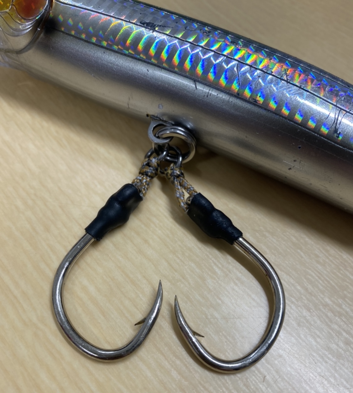 今回は和具のテンヤ丸さんに乗合での釣行でした。ナブラ少なくパヤオでの釣りで、朝イチ1投目に7kgのカツオ!ヒットルアーはフィードポッパー175でした。その後はキハダ、カツオは見えるもののヒットは無く終了となりました。釣果はカツオのみでしたが自作のツインフックでばっちりフッキングしていたので、釣果以上の収穫がありました!