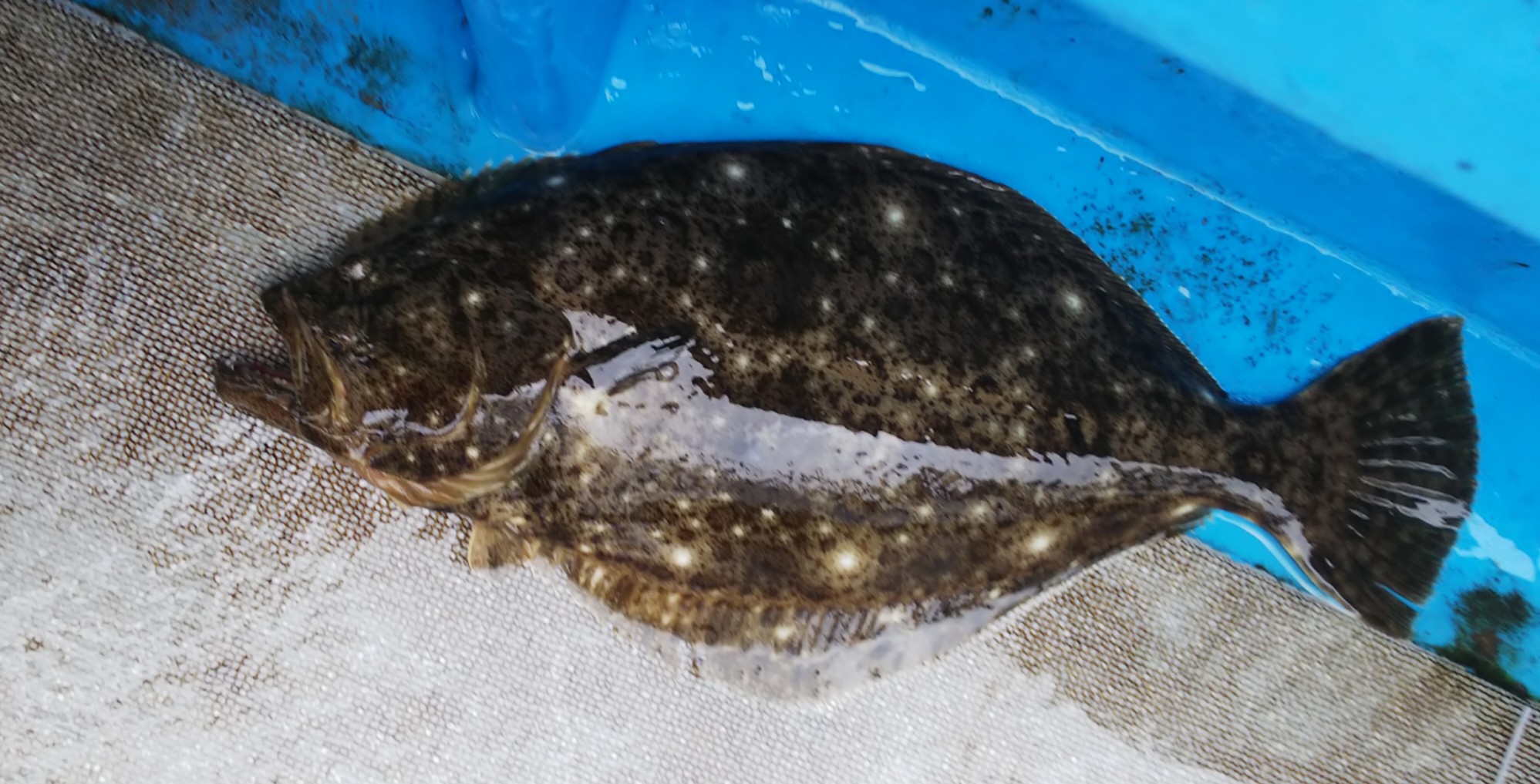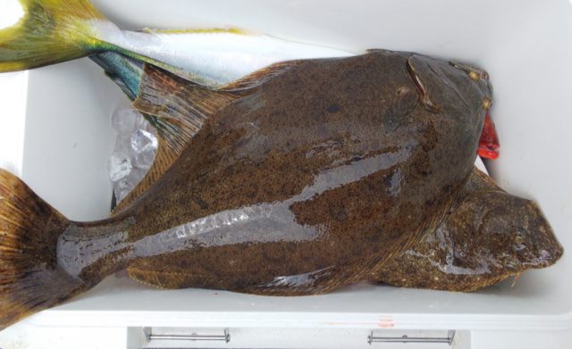 その後はベイトを探して落とすのですがすぐに反応が無くなり移動を重ねる。仲間は真鯛、青物と順調。サワラも姿を見せてテンションが上がる。しばらくしてベイト付いたのを確認後落として様子を見るとコン、コン、ゴンと良い当たり。慎重に巻いてくるとなんとヒラメ。かなり大きく見えて。