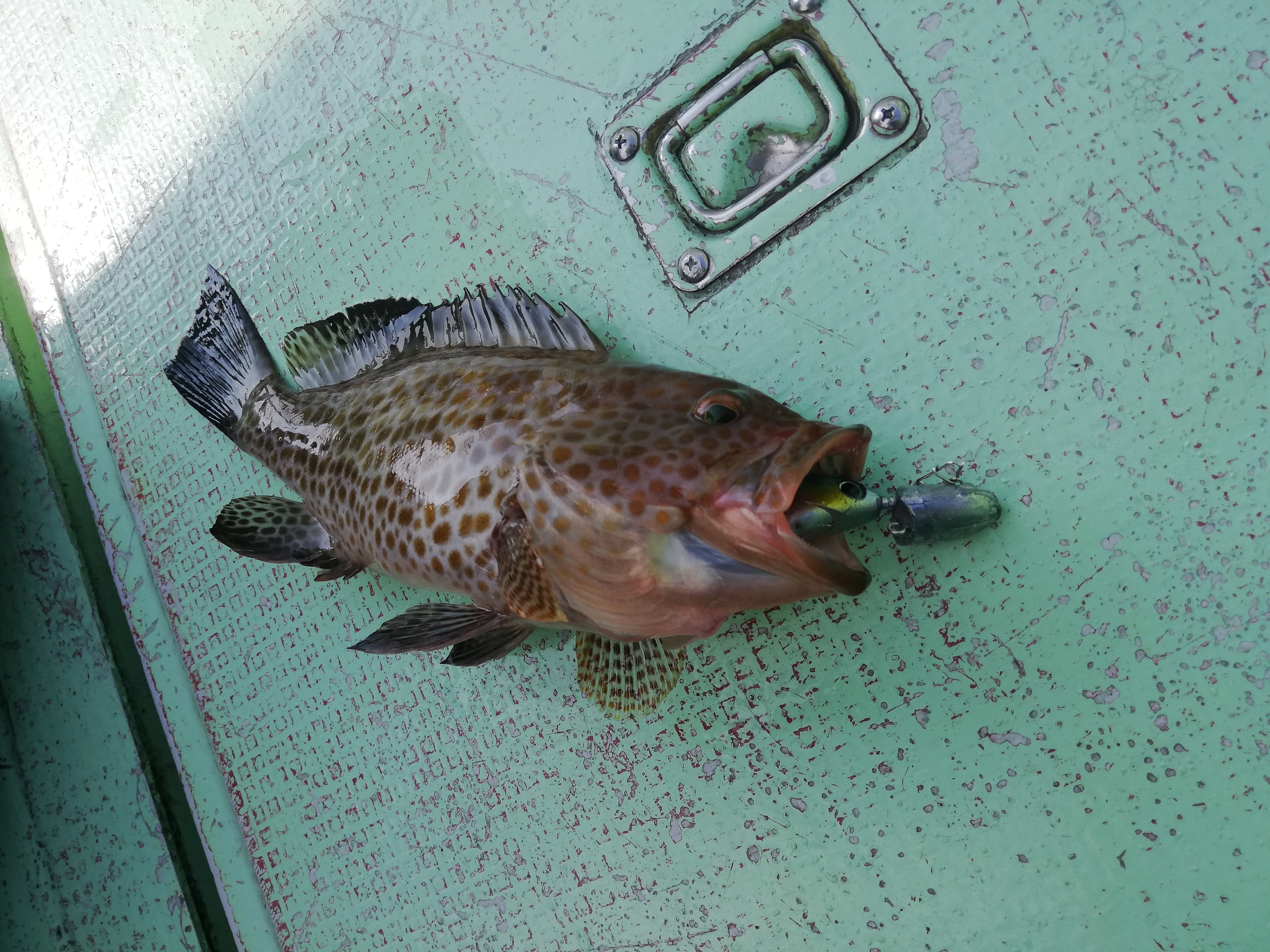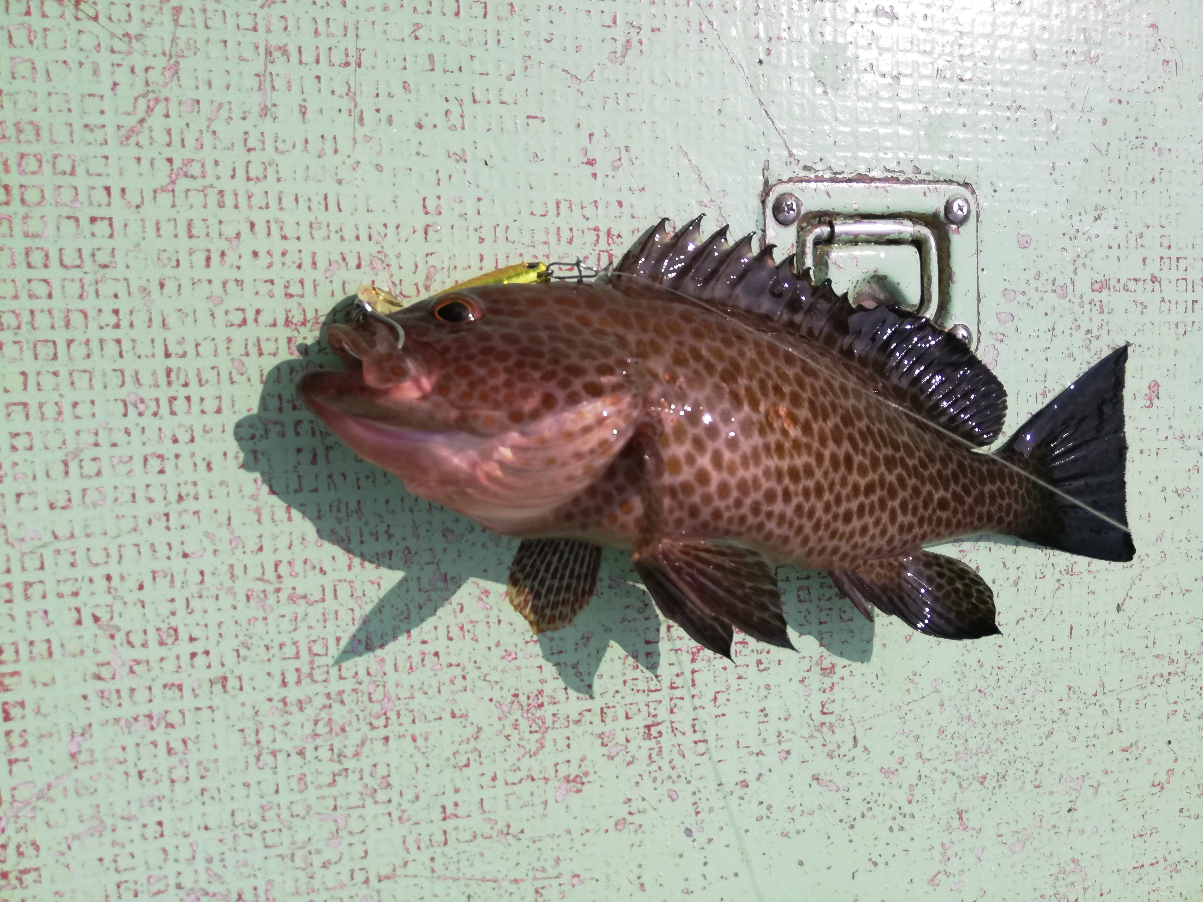 エコギア スイミングテンヤ30グラム+バルト4インチの組み合わせで狙いのオオモンハタをゲットできました!釣り方は10~15回リールを巻いてフォールさせるの繰り返し。フォール中にもよくアタるので、ラインを指で軽く押さえながらフォールさせるのがポイントです!